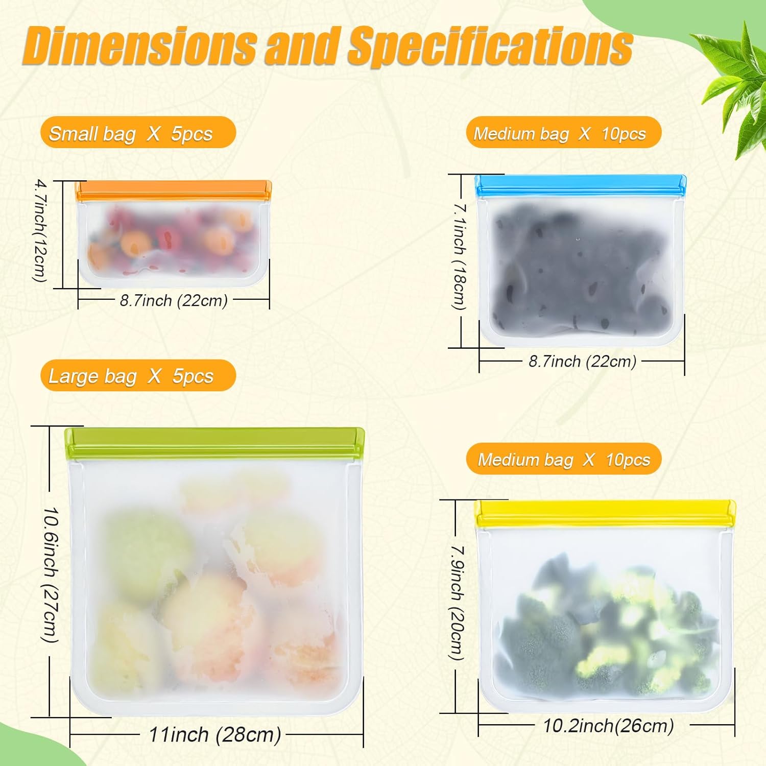 - 【Airtight and Leak Proof】The silicone reusable bags feature a double-seal zipper closure for a secure, leak-proof seal. The reusable bags are airtight, preventing liquids from leaking. The food bags are moisture-proof, dust-proof, and odor-resistant, ensuring long-lasting storage. Our leakproof reusable storage containers available in various sizes which can accommodate your needs for marinated meats, meal prep, frozen foods, sandwiches, snacks, lunches, vegetables, fruit, pet food, and more. Packs of 30 Colorful Reusable freezer bags included 5 Pack Snack Bags (8.7''x4.7''), 10 Pack Medium Bags (8.7''x7.1''), 10 Pack Large Bags (10.3''x7.9'') and 5 Pack Extra Large Bags (11''x10.6'')
