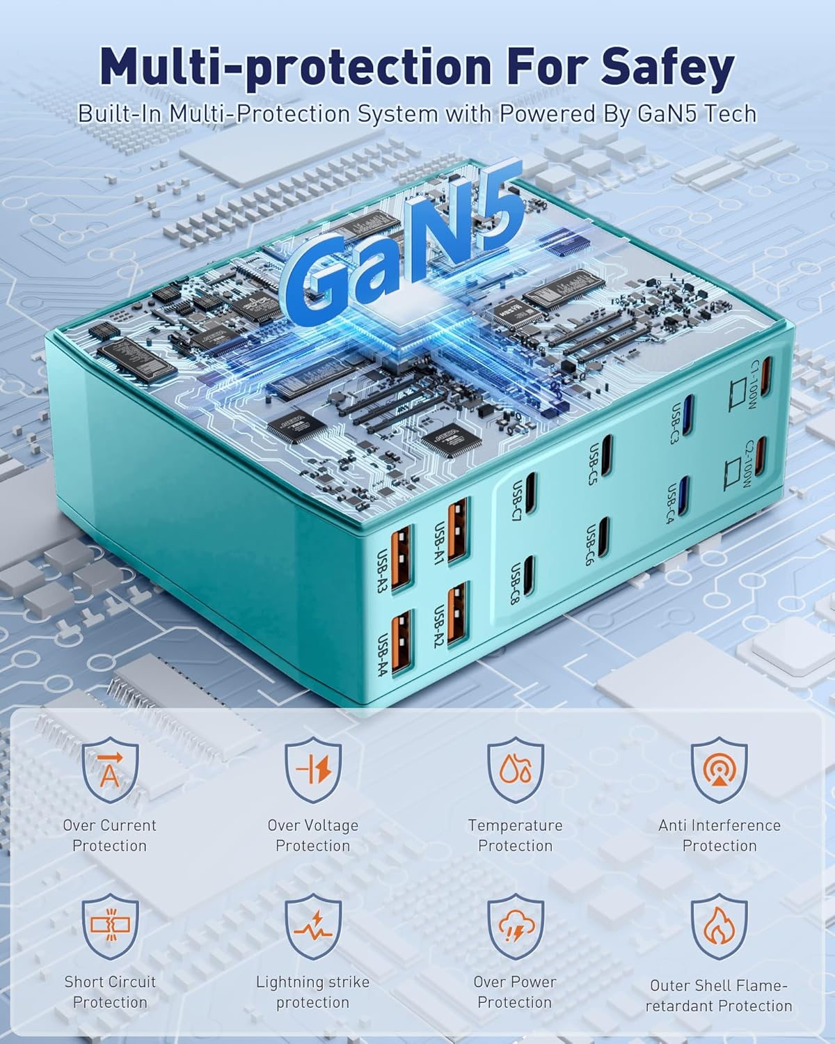 - 【12-in-1 USB C Charging Station】This 600W USB C Charger Block comes with 8 USB C ports and 4 USB A ports to charge multiple devices, simplify your charging setup, and let you experience the convenience of ultra-fast and ultra-high output charging. With its smart charging technology, it can automatically detect and provide the best power output for each connected device, ensuring fast and efficient charging.