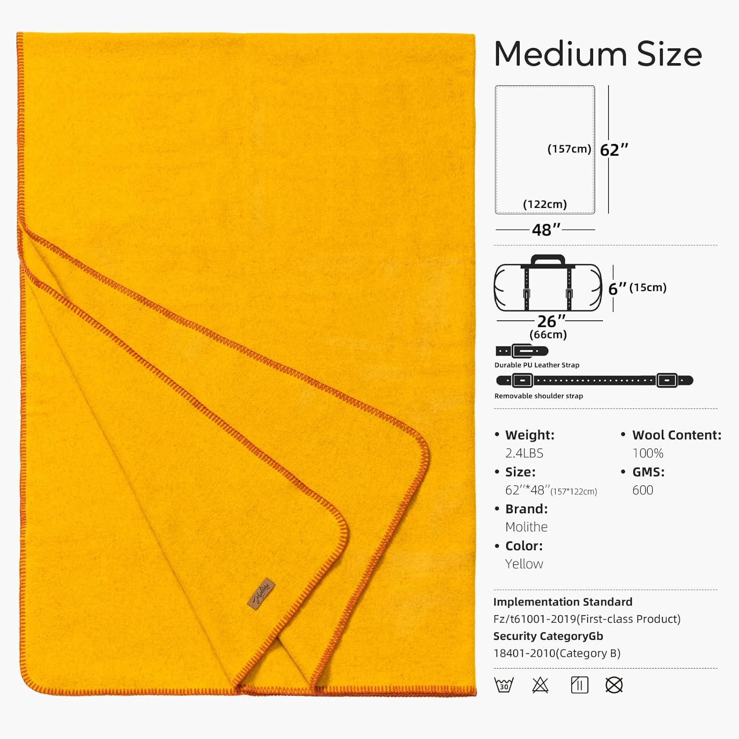 100% Wool Blanket, 48" x 62", Warm, Thick, Washable, Military Wool Blanket, Great for Camping, Outdoors, Sporting Events, Survival Kits, Yellow