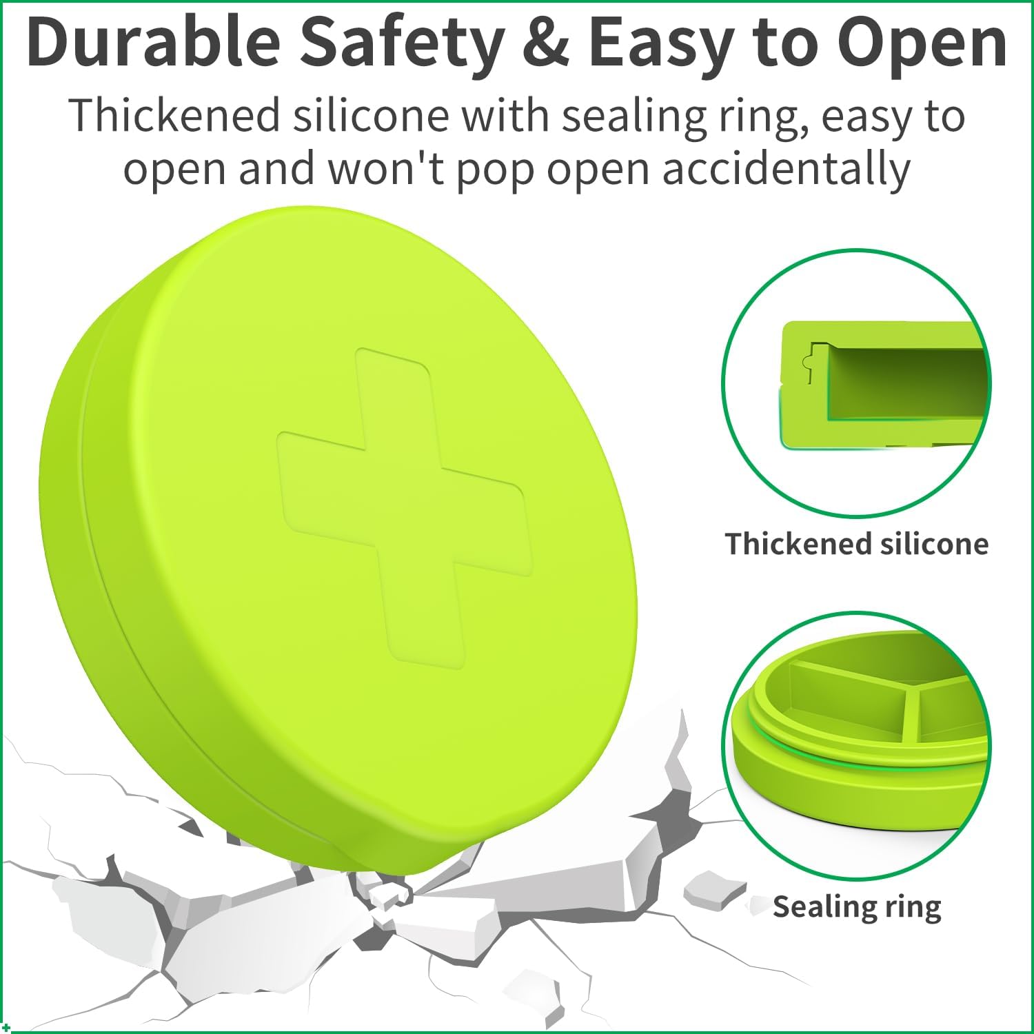2 Pack Small Pill Box,3 Compartment Round Silicone Travel Pill Box for Purse Pocket, Waterproof Portable Compact Medicine Holder for Vitamin, Cod Liver Oil, Supplement(Green+Teal)