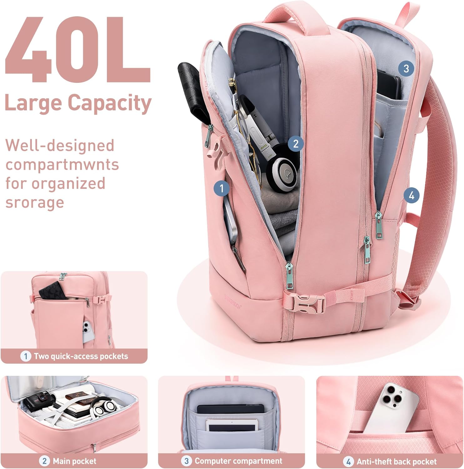 SHOWKOO Travel Backpack For Man Women, Airline Approved Carry On Laptop Backpack For Business, 40L Expandable Large Capacity Backpack, Pink