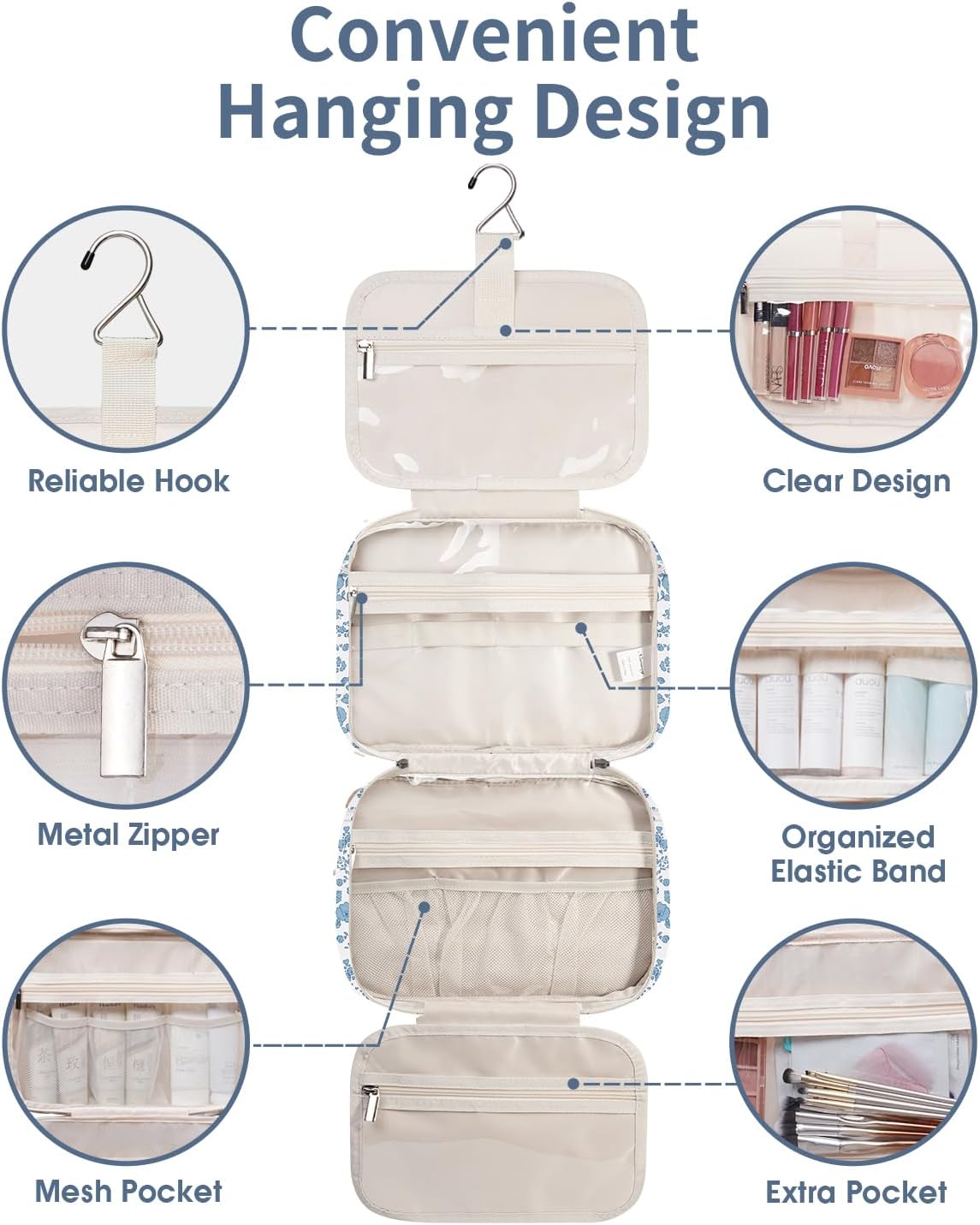 Narwey Travel Toiletry Bag for Women Large Hanging Makeup Bag Organizer Toiletries Bag for Full Size Essentials Accessories Cosmetics (Little Blue Flower (Large))