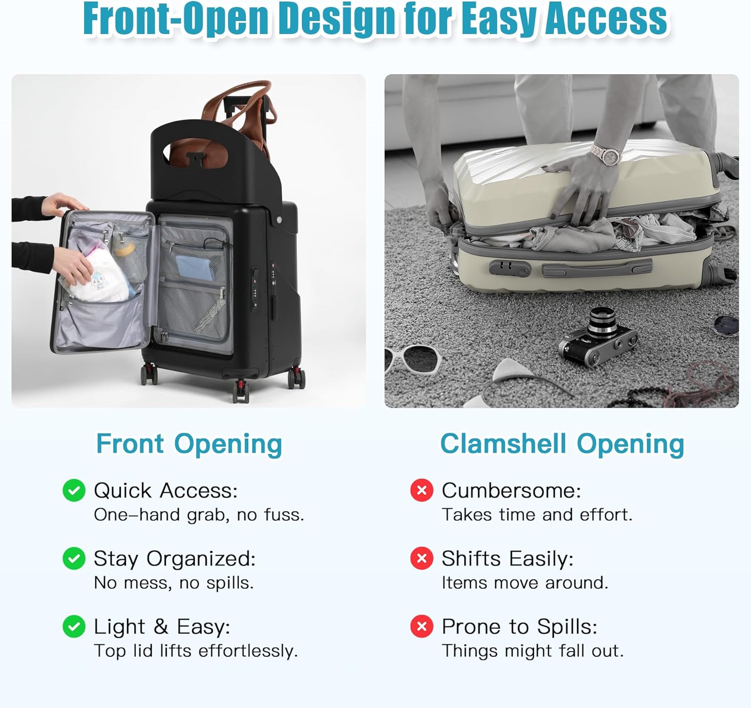 - 【Front-Open Design】 Access your belongings easily with the front-opening design that allows you to grab items with one hand. The top lid opens smoothly for quick access. The durable all-aluminum 3-stage telescoping handle offers easy maneuverability, and the built-in TSA lock adds extra security for peace of mind. Ideal for both kids and adults, this ride-on suitcase ensures a smoother, more efficient travel experience.