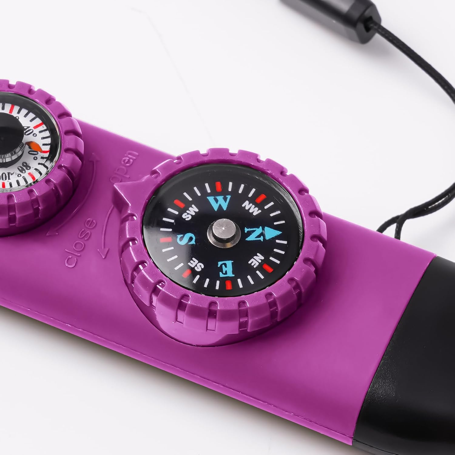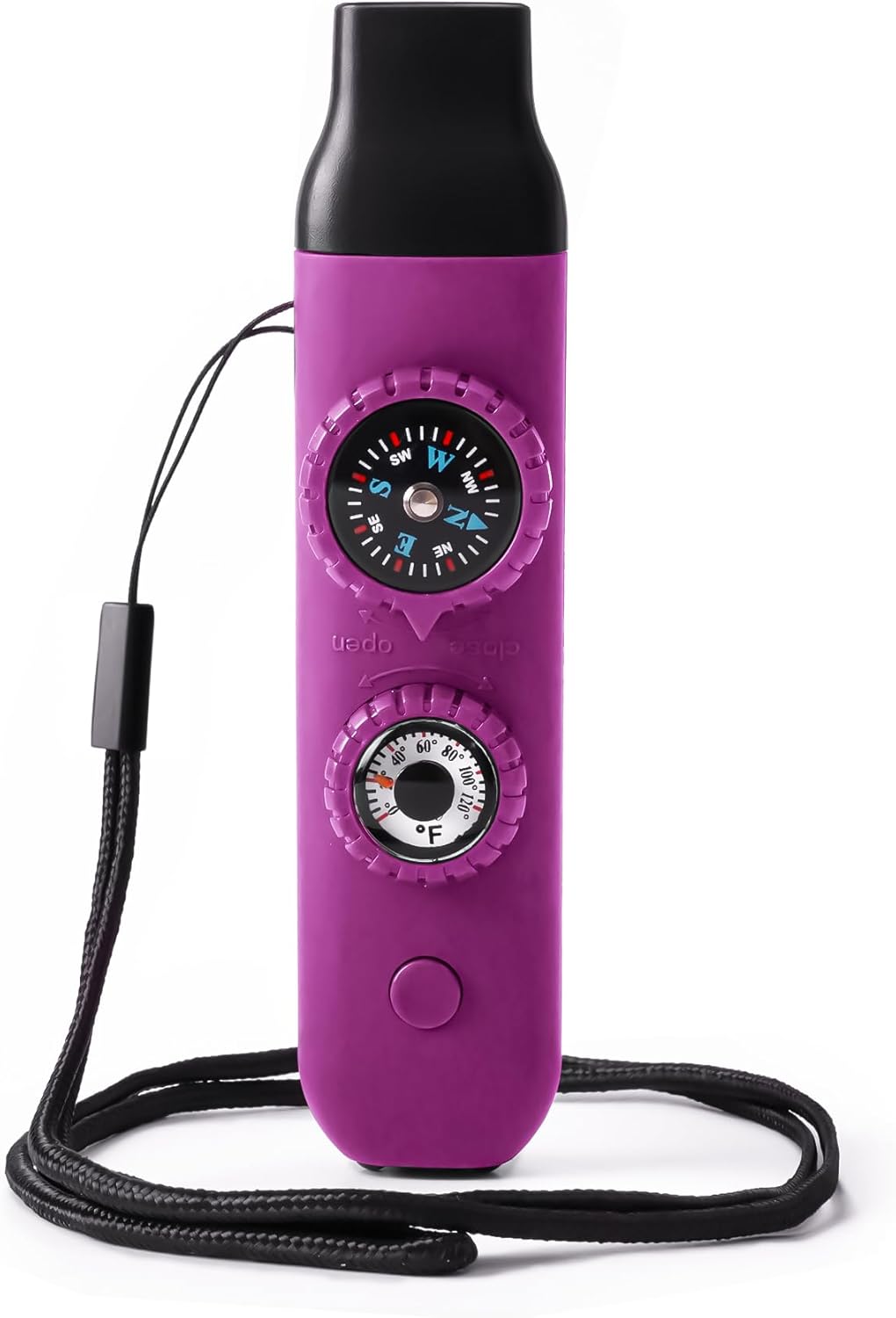 - The 7-in-1 Safety Whistle sets 7 functions including Emergency Whistle, Compass, Thermometer, LED Signal Light, Magnifying Glass, Reflector and Sealed Warehouse with good playability (The uniquely designed miniature built-in storage bin can be used to store important personal information, allowing rescuers to grasp your situation at the first time) (NOTE: If you need help in an emergency, you can try whistling softly, which is louder than whistling at full force)