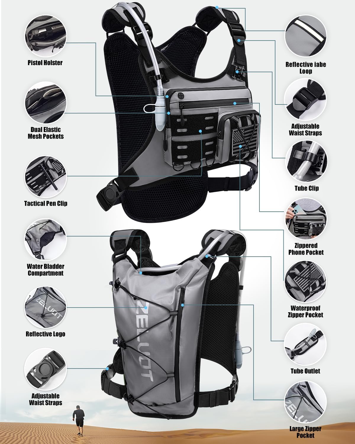 - Plenty of Storage - This chest bag features 3 waterproof zippered front pockets to securely hold essentials like your phone, keys, and energy gels. A detachable, bounce-free pistol holster ensures secure storage for small to mid-sized pistols, while the tactical pen slot keeps emergency gadgets within easy reach. Two large back pockets fit a water bladder, towel, extra clothing.