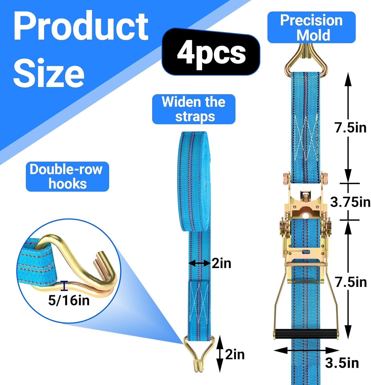 - High-Quality Ratchet Straps: These heavy duty ratchet straps are made of high-density propylene fiber and paired with all-steel heat-treated metal ratchets and hooks; The widened 2-inch strap is resistant to breaking and can withstand a pulling force of up to 4000 pounds. During transportation, even when encountering bumps and vibrations, the cargo straps ratcheting can firmly lock the goods, thereby greatly reducing the risk of slipping and shifting, and ensuring transportation safety