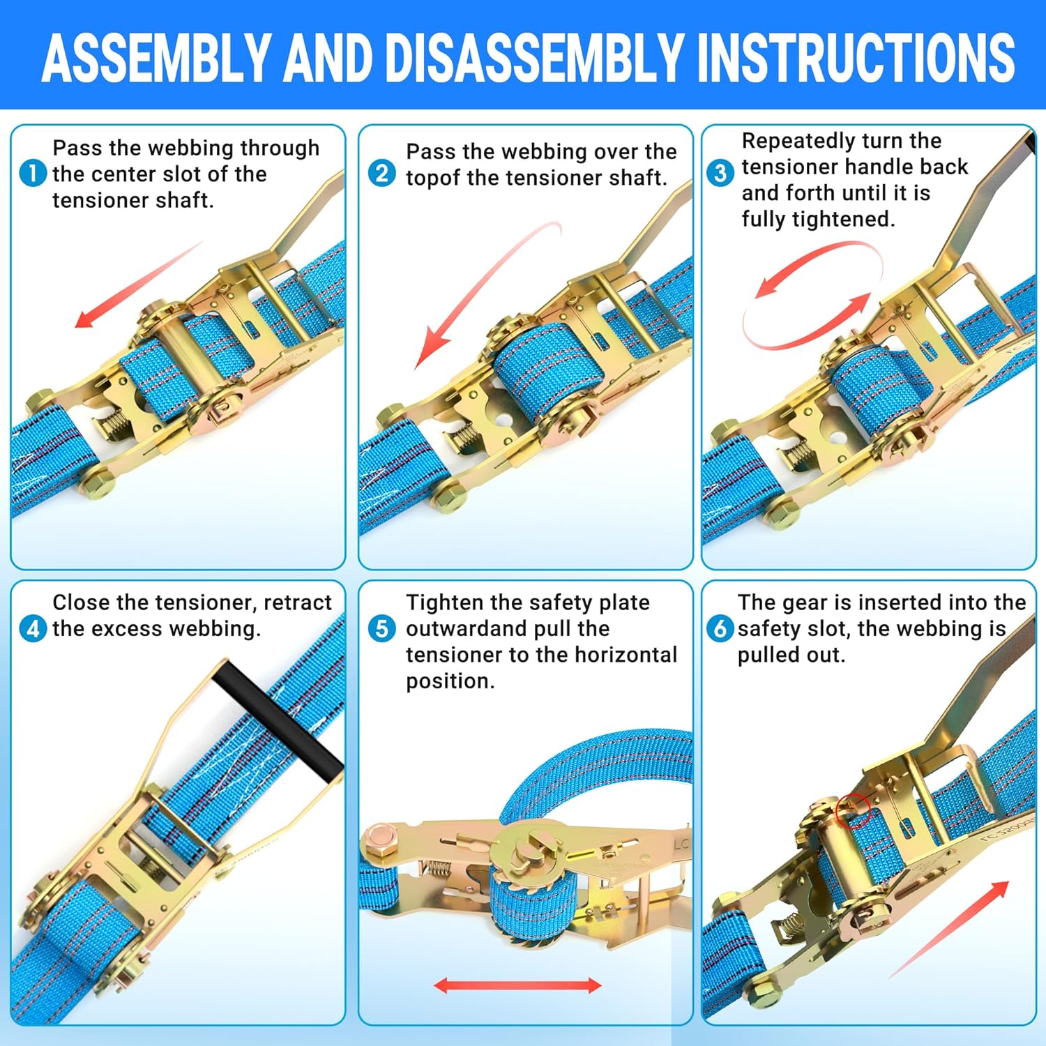 - Widened Ratchet Strap: The ratchet tie downs is 32 feet long and 2 inches wide, with moderate rigidity and flexibility, no elasticity, and will non-damaging to goods. The thickened and widened flat design enhances bearing capacity, with the precise gear cam structure enhancing grip, ensuring stable and safe transportation of goods. The blue tie down straps ratchet improves visibility during loading and unloading, while the black handle is comfortable to hold, reducing operator’s fatigue