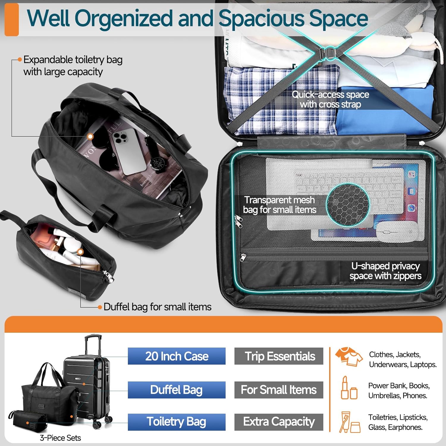 - 1 Set for Multiple Needs: The Luggage sets include a 20-inch carry-on suitcase, a spacious duffle bag for bulkier items like clothes, laptops, and umbrellas, and a toiletry bag for toiletries and cosmetics. Perfectly designed to meet diverse storage needs during travel.