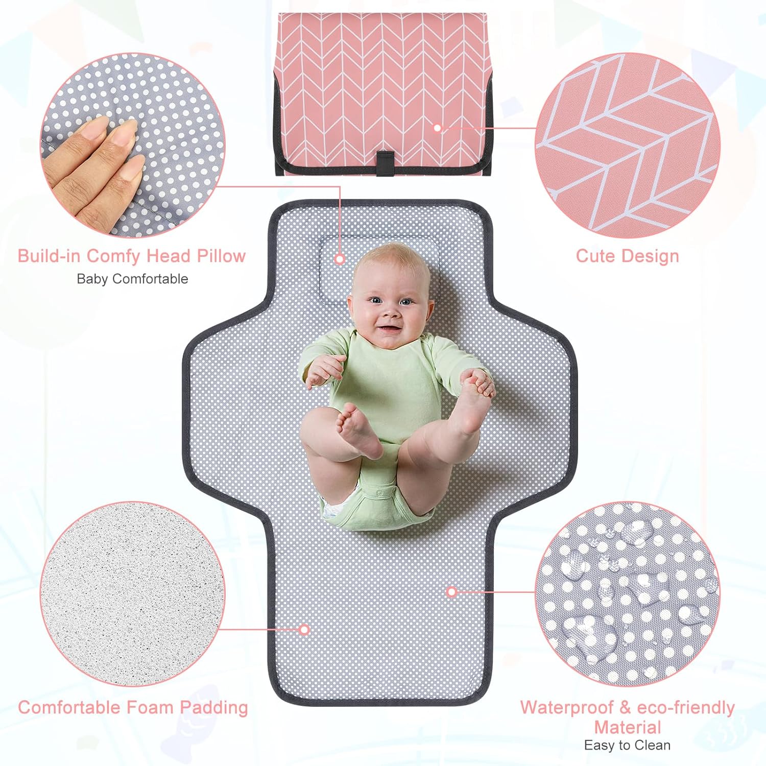 - Soft Cushion Padding : Our diaper changing mat with soft filling inside for extra comfort. It provides a soft and clean diaper changing station anywhere conveniently.