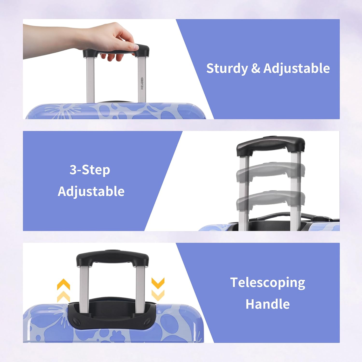 - Carry & Move:Silicone handles make it easier to lift your suitcases when going up and down stairs. Sturdy 3-step telescoping handle slso allow you to maneuver in tight spaces and provide effortless movement.