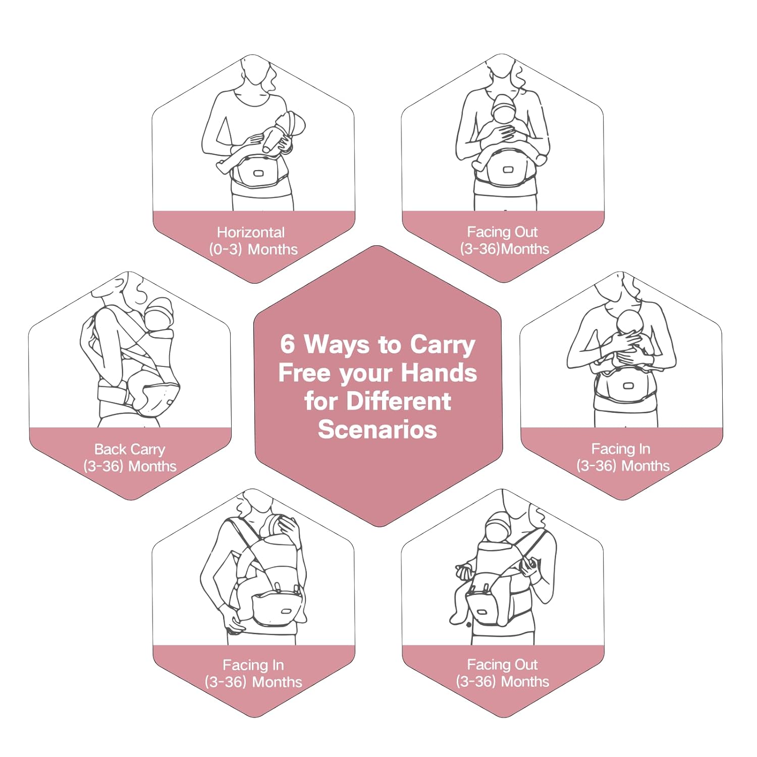 - 【6-in-1 Versatile Baby Carrier】SEEDNUR baby carrier offers 6 carrying positions—hip seat (sitting/lying) and carrier (front-in, front-out, back)—suitable from newborn to toddler. Hip baby carrier is best used by babies 6 months and older (or 15 lbs+) who can sit upright independently. The ergonomic seat width perfectly fits your baby's leg position and promotes healthy hips.