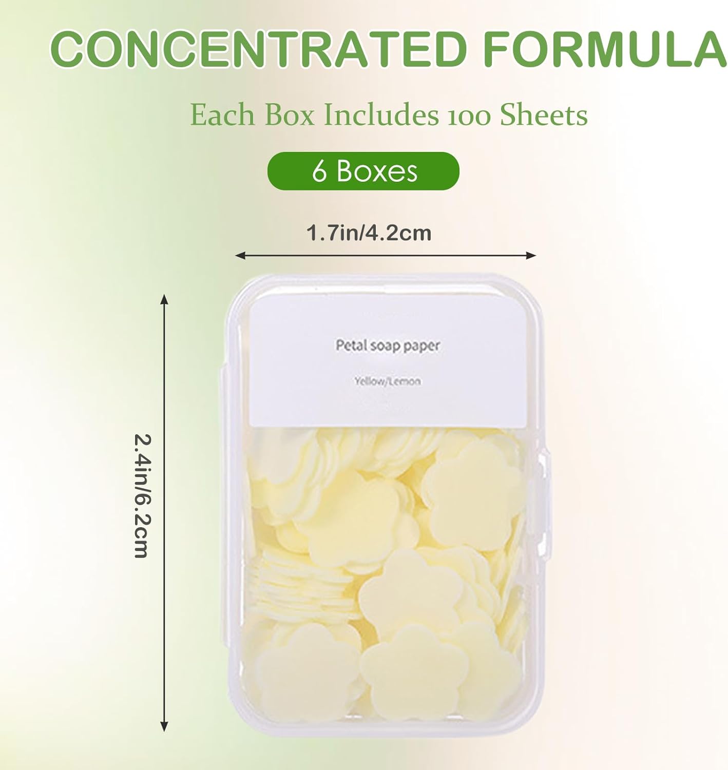 - 600 Sheets in 3 Delightful Scents: This set includes 6 portable cases of mini soap sheets, each infused with a unique fragrance: Pink Rose, Green Jasmine, and Yellow Lemon. Each case holds approximately 100 sheets, giving you a total of 600. A refreshing variety of floral and citrus scents to suit different moods and preferences.