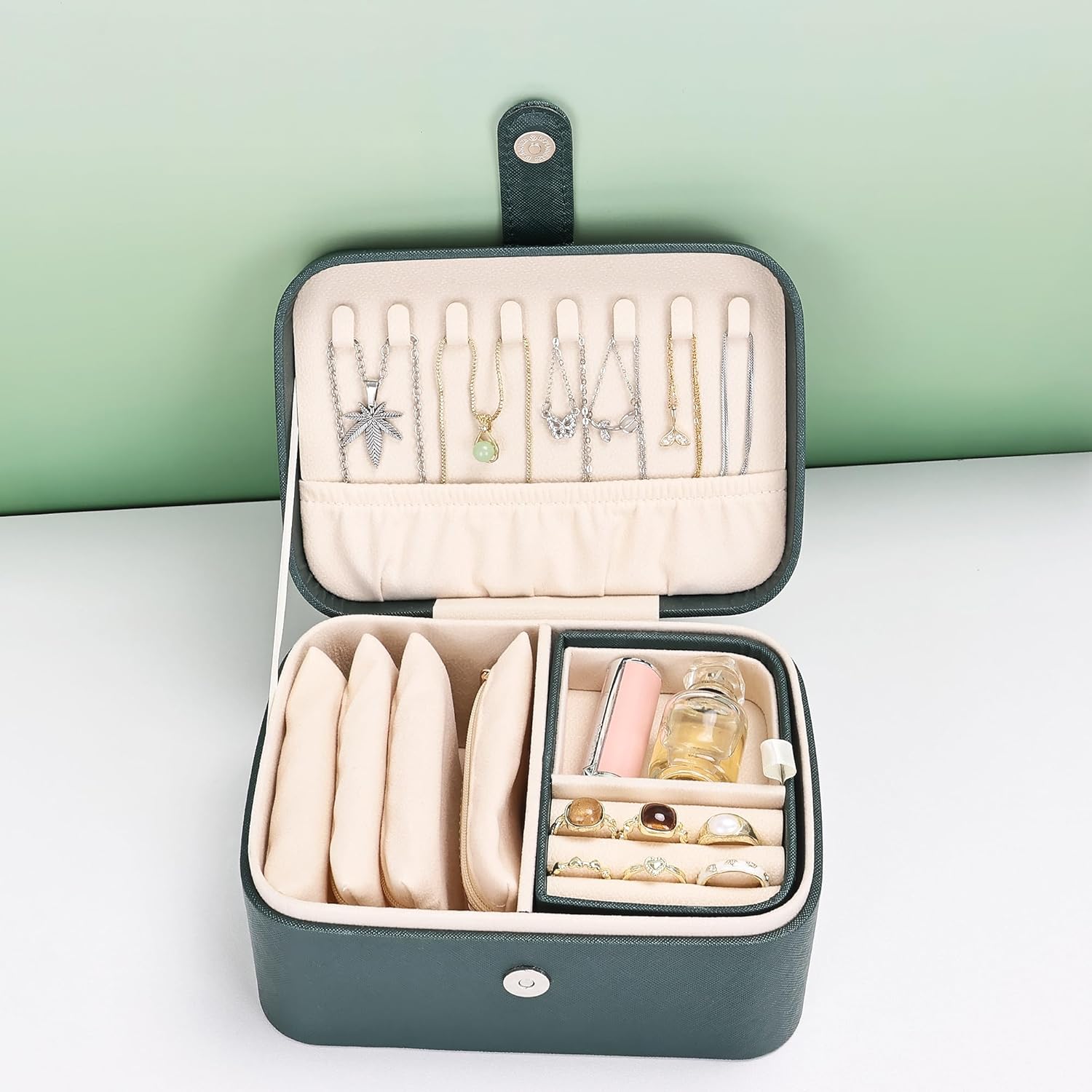 2 Layer Large Jewelry Travel Case with 4 Jewelry Pouches, PU Leather Portable Jewelry Storage Box, Medium Size Jewelry Organizer Box for Earrings, Necklaces, Bracelets (dark green)