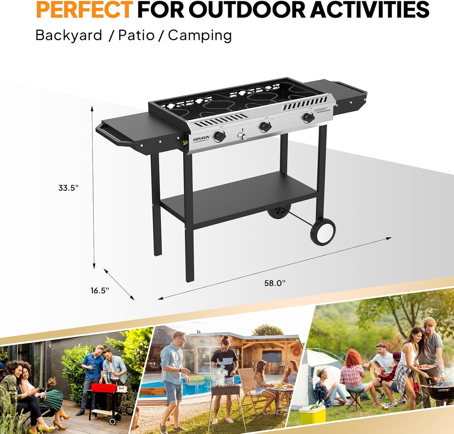 - High-Performance Cooking System: Featuring dual 75,000 BTU cast iron burners with independent controls (total 225,000 BTU output), this stove delivers precision heat adjustments from gentle simmer to intense flame. Ideal for searing, boiling, and versatile culinary tasks, ensuring professional-grade results in outdoor settings