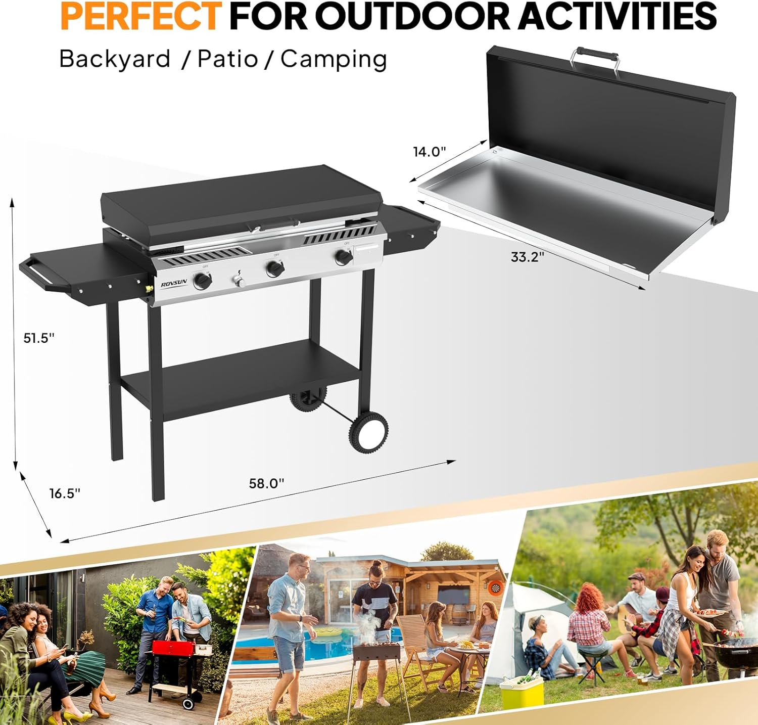 ROVSUN 3 Burner Outdoor Propane Gas Stove with Griddle, Ignition & Side Shelves, 225,000 BTU Powerful Gas Stove Outdoor Cooker for Backyard Patio Cooking Home Camping Grilling Canning Turkey Frying
