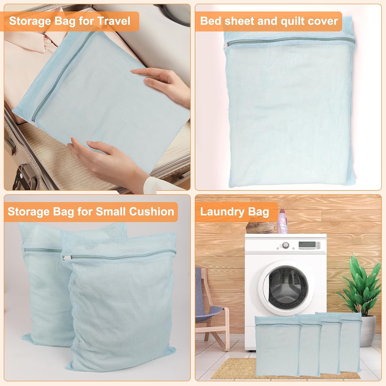 - 【 Packaging List 】BLUE 4 PIECES COTTON MESH ZIPPERED LAUNDRY BAGS, LARGE AND STURDY: Our 14.96-inch x 17.71-inch laundry bags are made of pure cotton for long-lasting use!