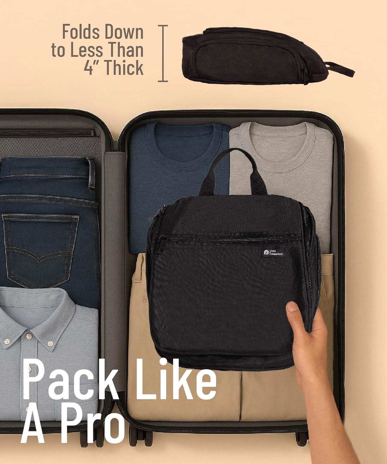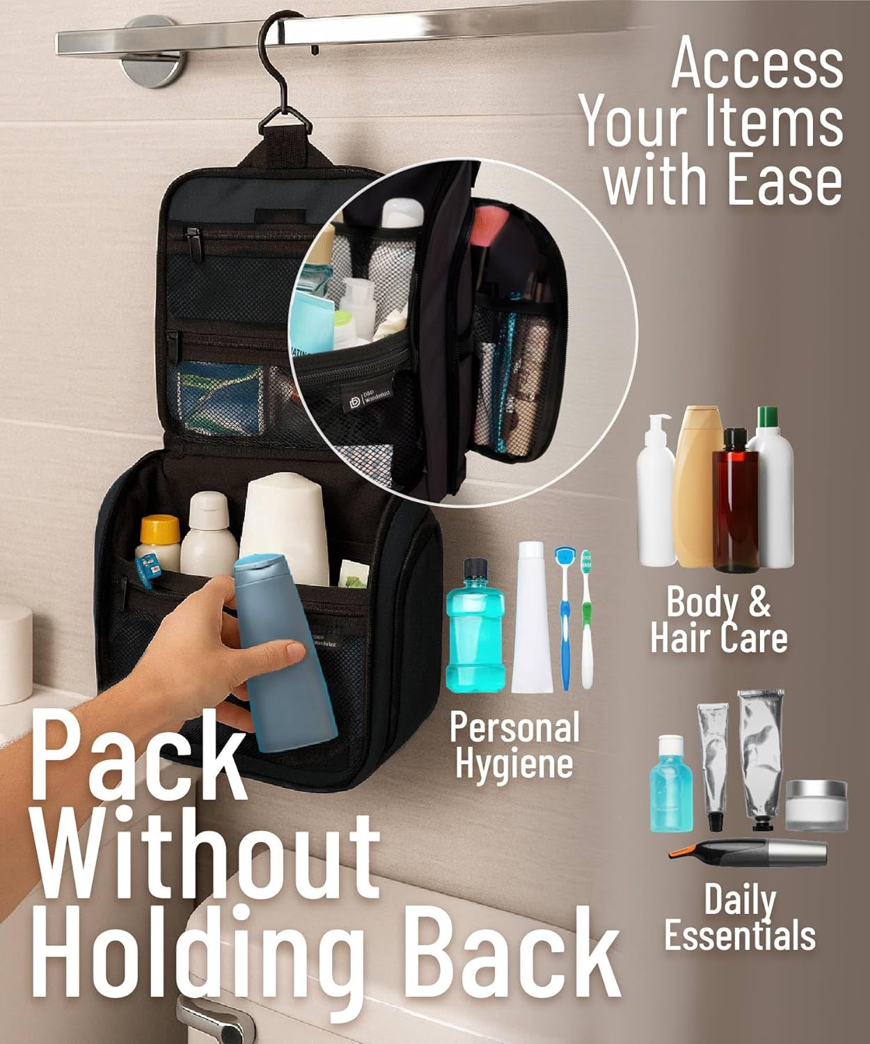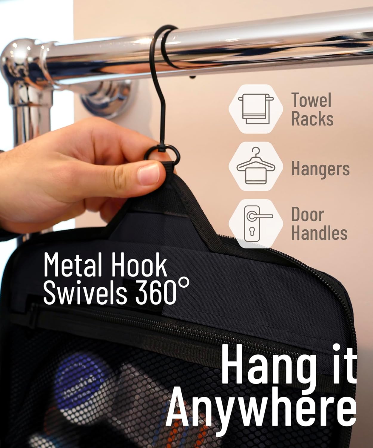 - HANGING HOOK:: The XXL metal swivel hook allows you to hang the bag anywhere, saving valuable counter space. It's perfect for use in hotels, bathrooms, or even on a camping trip.