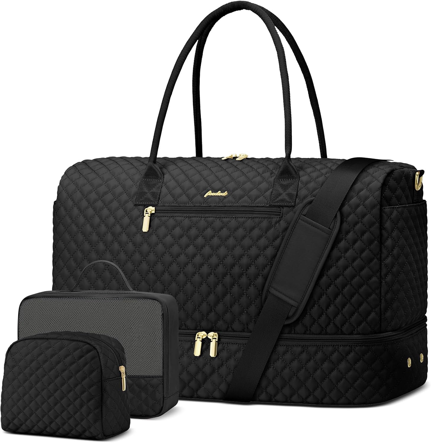 Travel Weekender Duffle Bag for Women - Overnight Bag with Shoe Compartment Carry on Bag with Toiletry Bag Gym Duffel Bag with Wet Pocket Hospital Bags for Labor and Delivery 3 Pcs Set Black