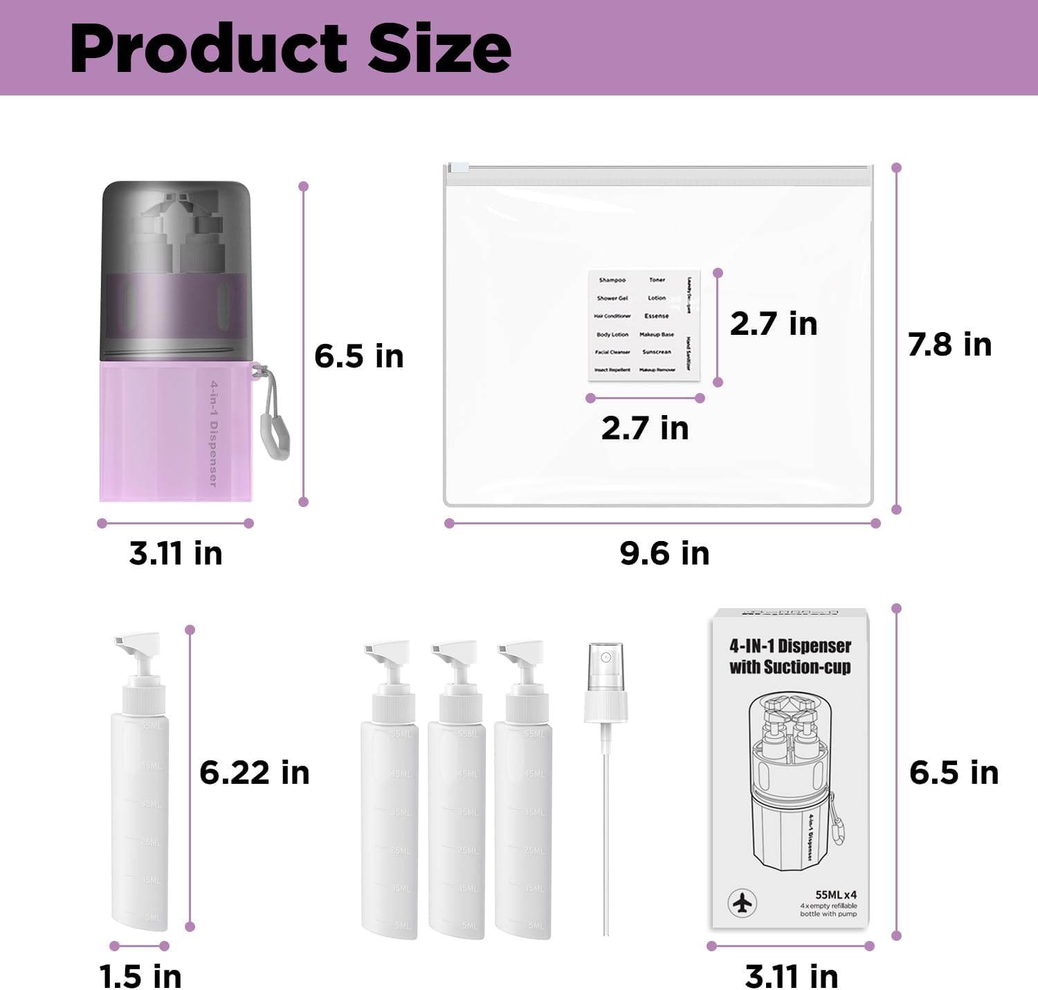 - ๐๐ก๐๐ญ ๐๐จ๐ฎ ๐๐๐ญ This 4 in 1 travel dispenser bottle set includes 4*2oz lotion dispenser bottles, 1 spray pump head, 1 silicone suction cup holder, 1 mouthwash cup,1 clear bag, and sorting label stickers.Mix and match the lotion dispensers, spray pump, and other accessories as neededโcustomize your travel kit to suit any trip.