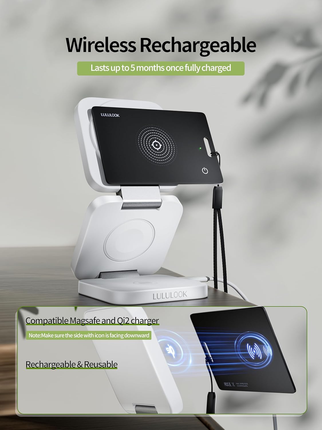 - [Wireless & Rechargeable]: LULULOOK Apple find my wallet card can be wirelessly charged on any Qi or MagSafe charger. Once charged, it will last in your wallet for up to 5 months. Rechargeable function reduces waste and saves time and energy in purchasing new batteries. (Android devices are not supported)