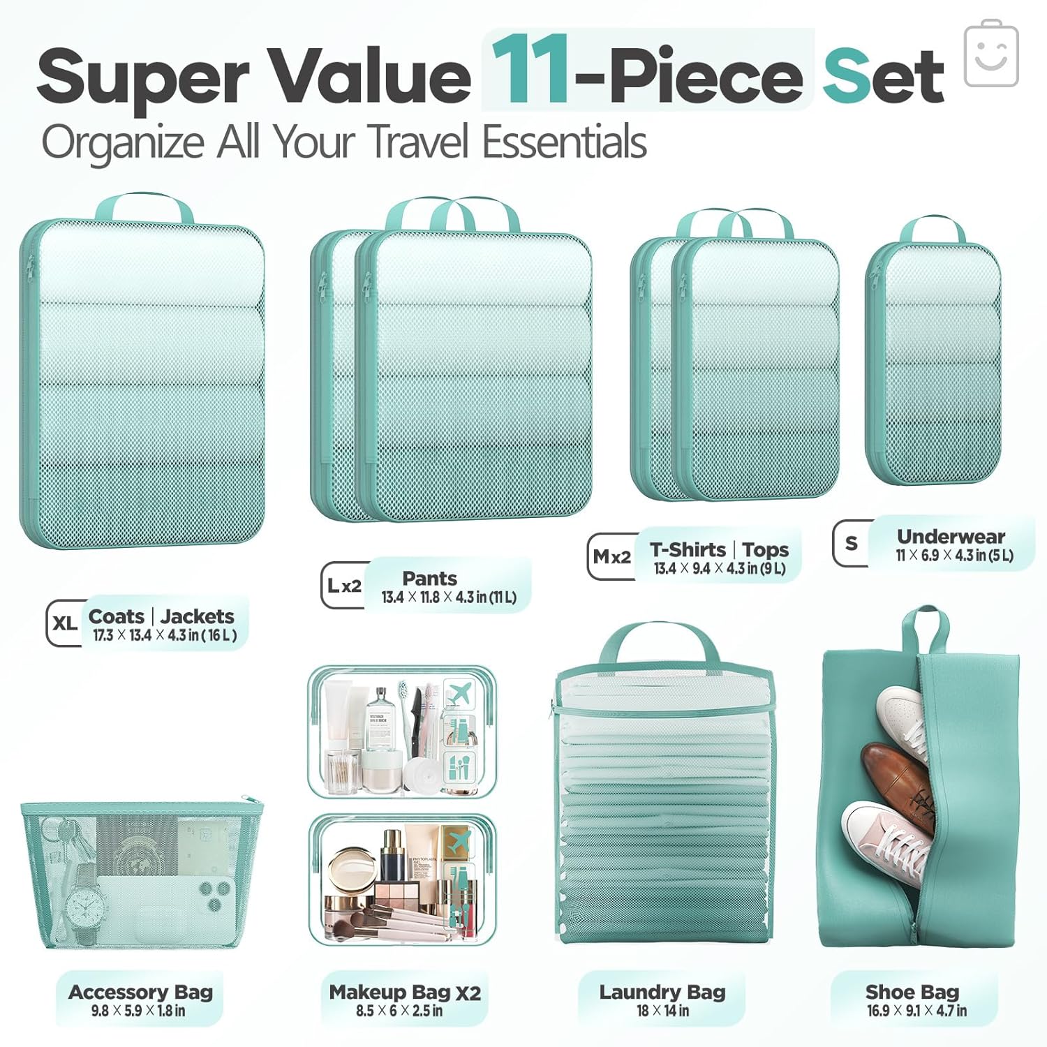Veken 11 Set Compression Packing Cubes for Travel Essentials,Compressible Expandable Large Luggage Suitcase Organizer Bags for Clothing,Durable Space Saver Storage Bags with Toiletry Bags(Blue Green)