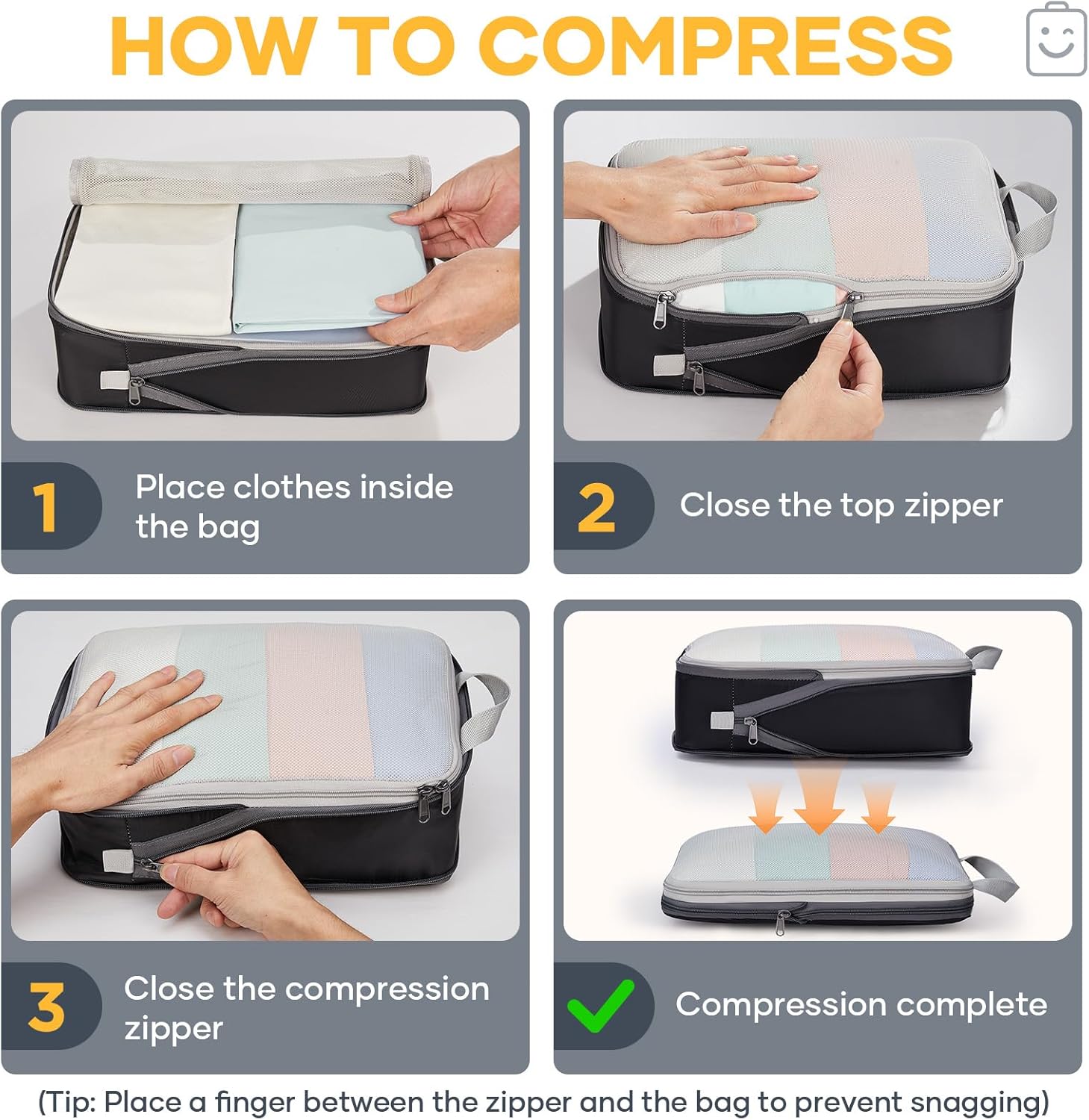 - Space-Saving Compression - Simply zip the compression zippers to reduce volume—no extra tools needed. Maximize luggage space efficiently, allowing you to pack more with less bulk for a lighter travel experience.