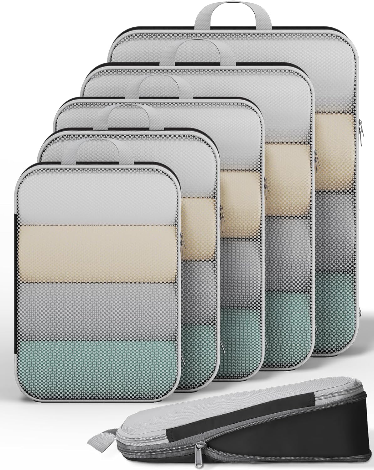 - Your Portable Travel Wardrobe - This 6-piece set includes 6 compression cubes in four sizes (S, M×2, L×2, XL) to keep your luggage tidy and organized. The S cube organizes small items like underwear and socks; the M cube fits T-shirts and shirts; the L cube holds jeans and light sweaters; while the XL cube accommodates bulkier clothing such as coats and sweaters.