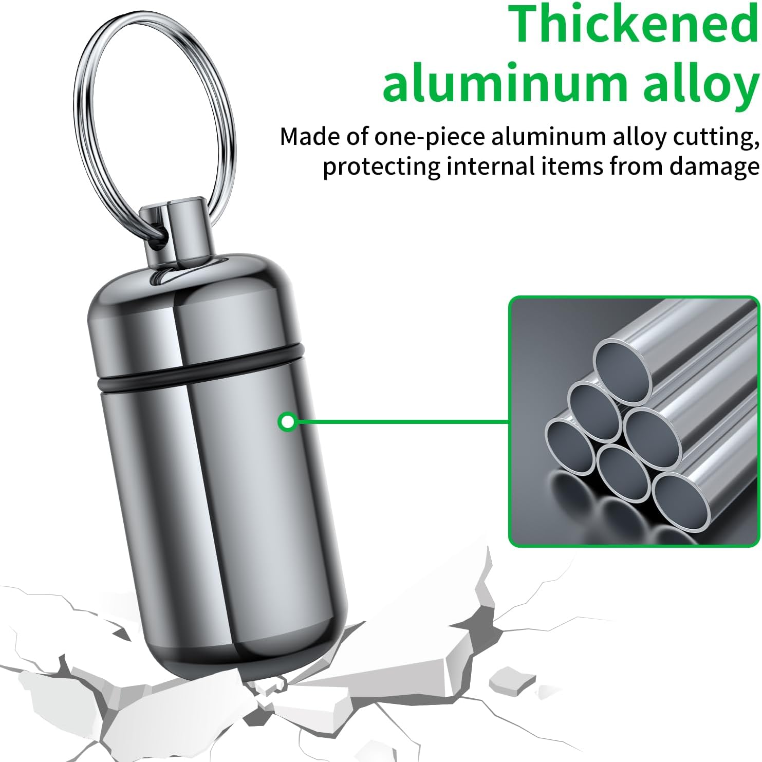 - Metal Keychain Pill Holder: Crafted from premium thickened aluminum alloy material, it is durable and corrosion resistant, exceptionally sturdy to withstand bumps and drops, keeping your pills safe during daily activities.
