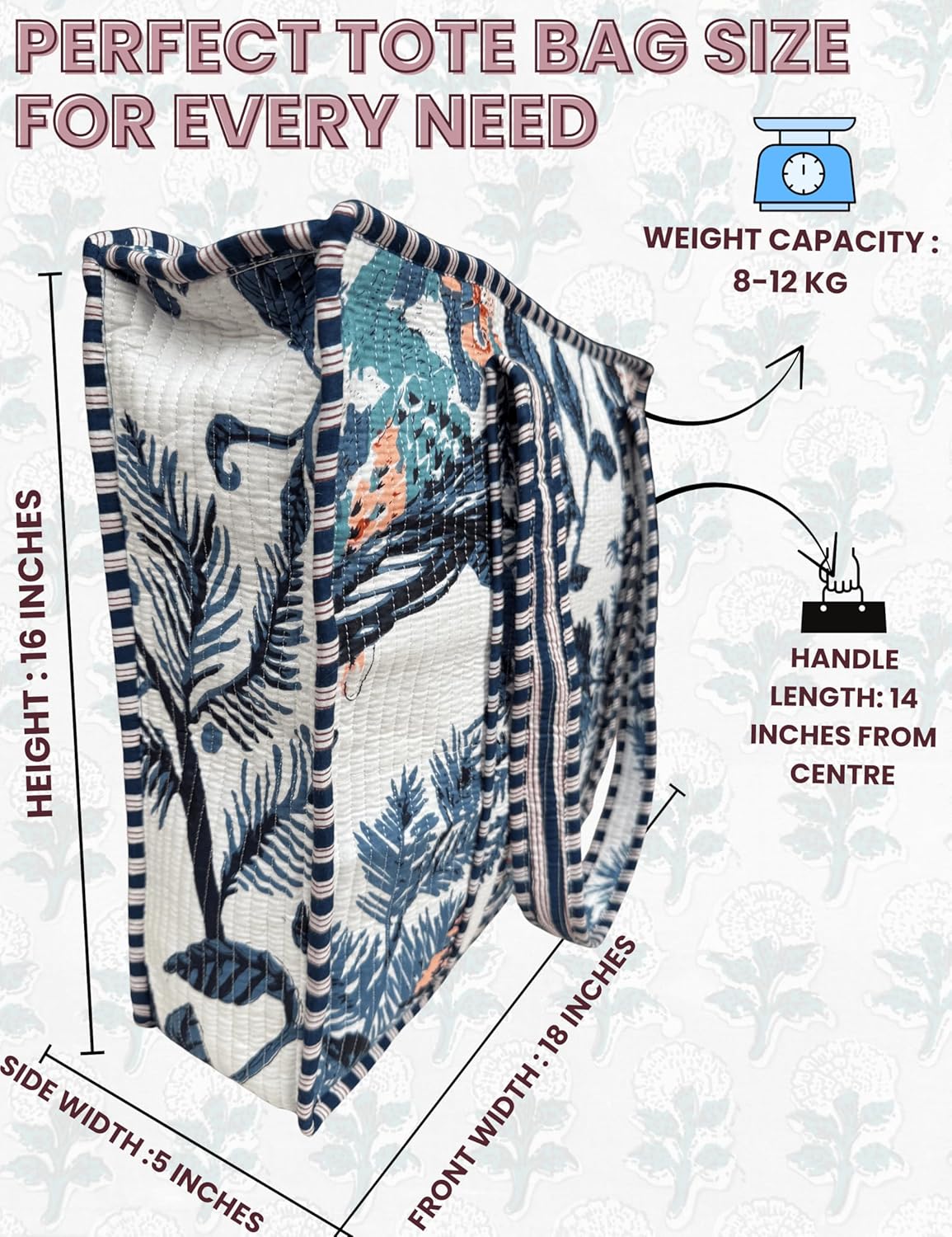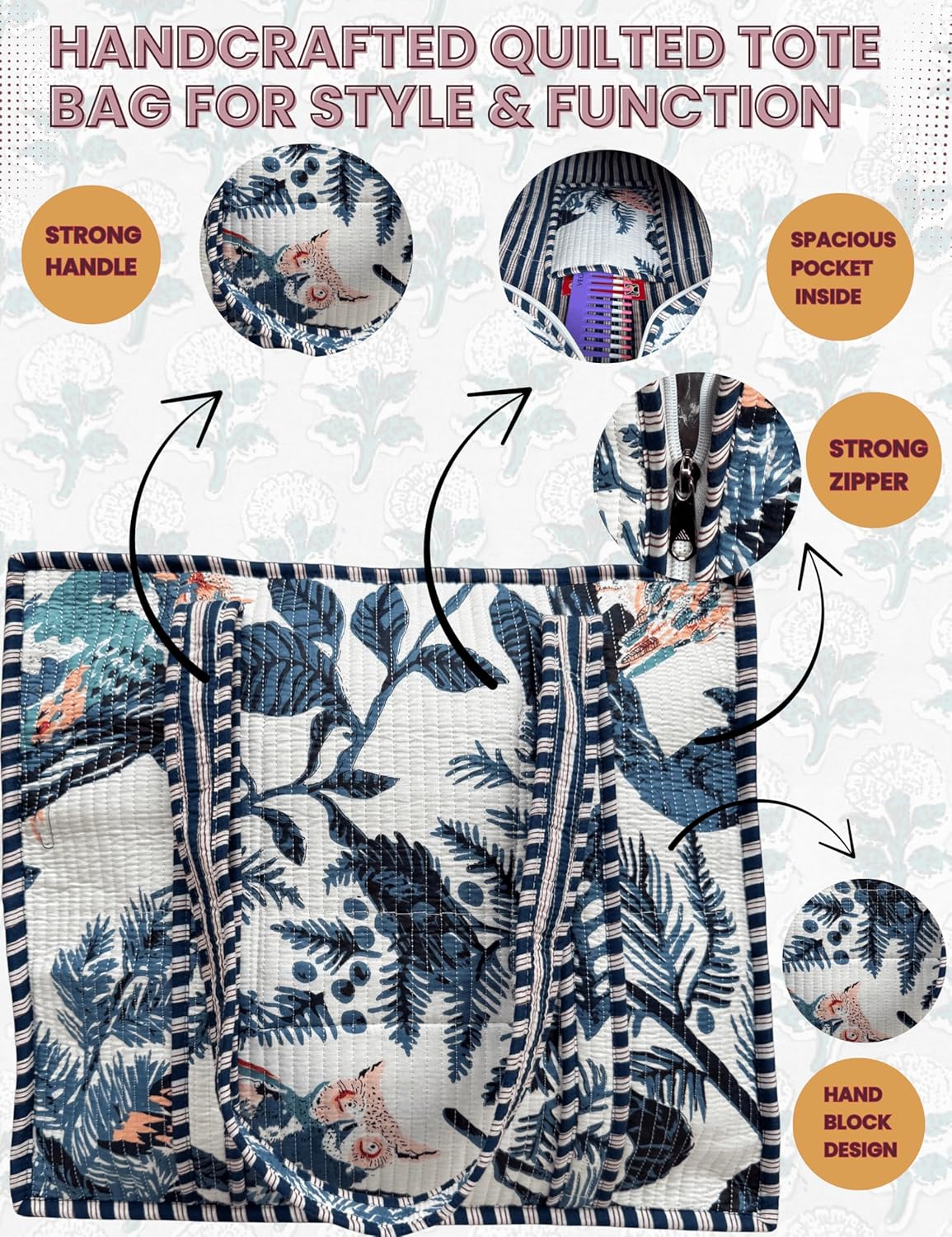 Cotton Quilted Tote Bag for Women – Large Beach & Travel Tote with Zipper, Reusable Grocery Bag