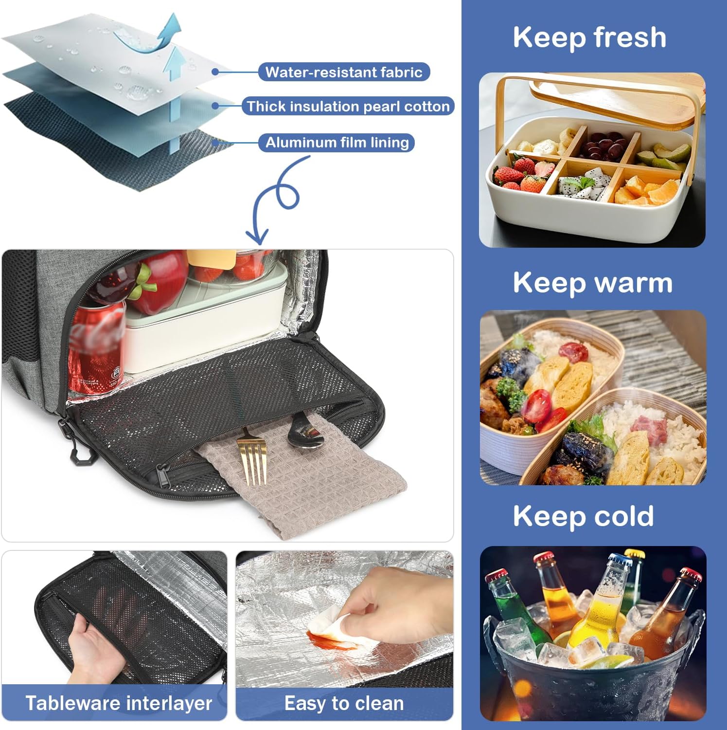 - Insulated Backpack with Lunch Box: Below the work lunch backpack is the lunch box compartment, measuring approximately 12.5”L x 6.7”W x 7.4”H, which can easily accommodate meals, drinks and fruits. And there is a zippered pocket for utensil storage. The backpack cooler compartment is made of thickened foam insulation and aluminum foil lining, which not only keeps food warm and fresh, but also keeps drinks cold. And it's easy to clean, just wipe up stains with a paper towel or rag