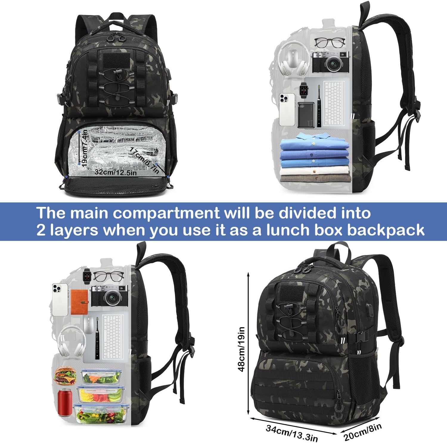Laptop Lunch Backpack for Men - 40L Large Capacity Work Backpack with Lunch Compartment and USB Post, RFID Insulated Cooler Backpack for Work, Travel, Picnic, Dark Camo
