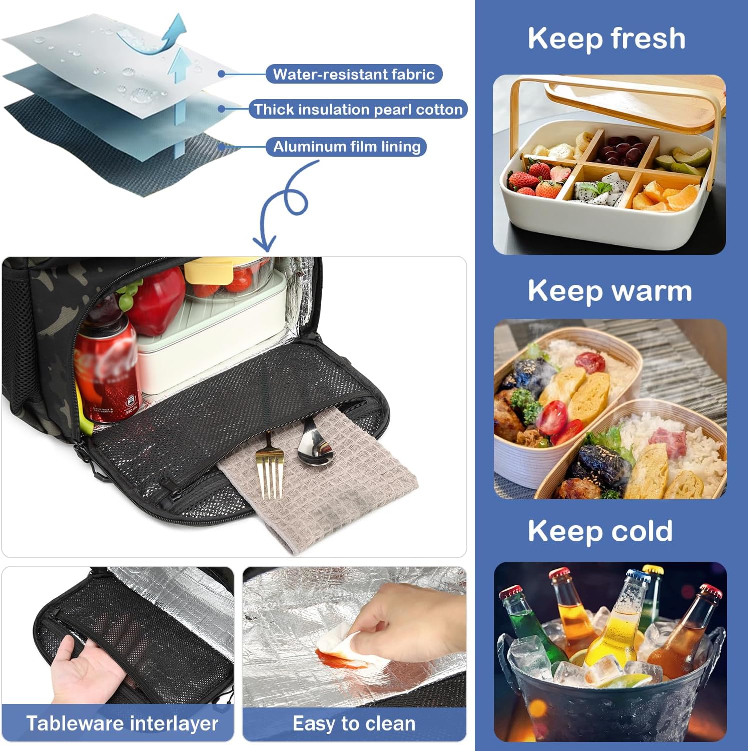 - Insulated Backpack with Lunch Box: Below the work lunch backpack is the lunch box compartment, measuring approximately 12.5”L x 6.7”W x 7.4”H, which can easily accommodate meals, drinks and fruits. And there is a zippered pocket for utensil storage. The backpack cooler compartment is made of thickened foam insulation and aluminum foil lining, which not only keeps food warm and fresh, but also keeps drinks cold. And it's easy to clean, just wipe up stains with a paper towel or rag