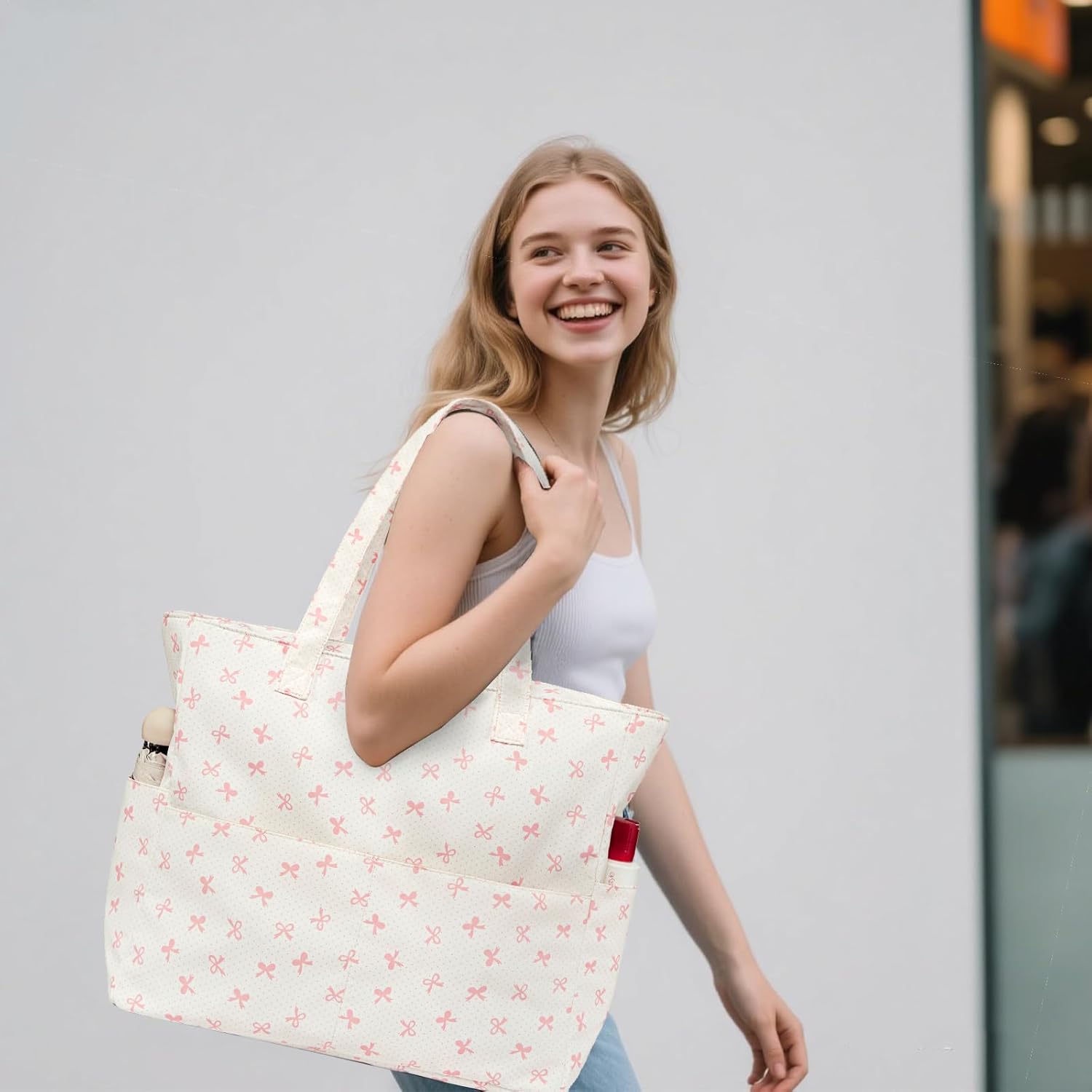 - Tote Bag with Zipper perfect for carrying when you step out for beach, travel, weekender, swimming, pool, gym, s hopping, picnic since it folded up small and lightweight, can be tucked in your backpack or luggage case easily. Also a good choice for reusable grocery tote, diaper bag, carry-on bag, travel bag, storage bag, really a super practical beach bag for women, grab one of them, it will not let you down.