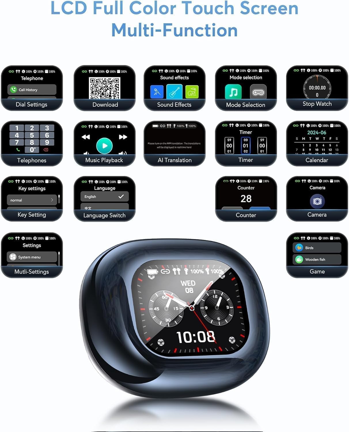 - Multifunctional Intelligent Touchscreen: Our MQO30 AI Touchscreen Earphones are a touchscreen earphone equipped with a color touchscreen. You can use the earphones or the charging case to control music playback, switch tracks, answer and end calls, and activate noise-cancellation modes. Additionally, the touchscreen offers a variety of functions, such as volume adjustment, camera control, switching between seven languages, wallpaper switching, screen brightness adjustment, earphone search, and timer.