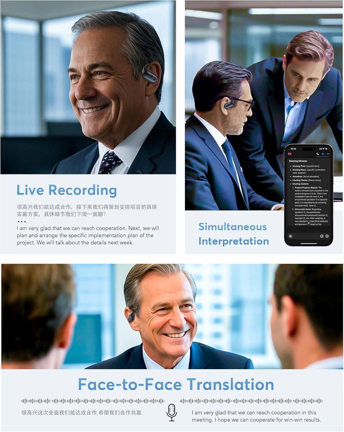 - 4-in-1 and Multi-Scenario Translation Mode: This pair of headphones integrates translation, music playback, and call functions, making it an ideal choice for both work and leisure. It features innovative modes such as live recording, simultaneous interpretation, face-to-face conversation, video calls, and voice calls. During calls, the app generates an invitation link that allows seamless communication through a web browser with real-time translation, ensuring smooth interaction.