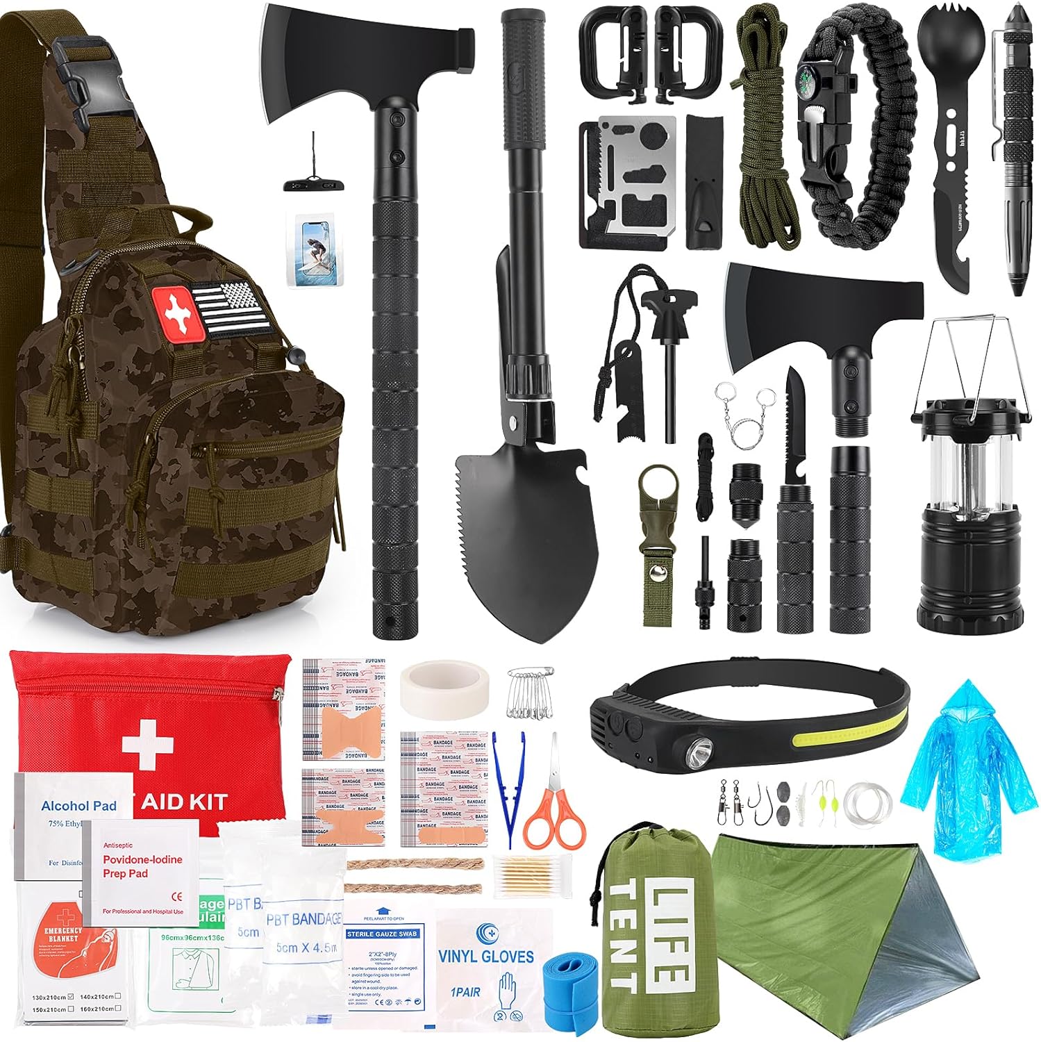 Survival Kit, 268 Pcs Emergency Survival Gear and Equipment Supplies with First Aid Kit, Camping Axe, Headlamp, Tent, Crossbody Bag for Camping Hiking, Hunting, Car, Gift for Christmas Men, Dads, Him