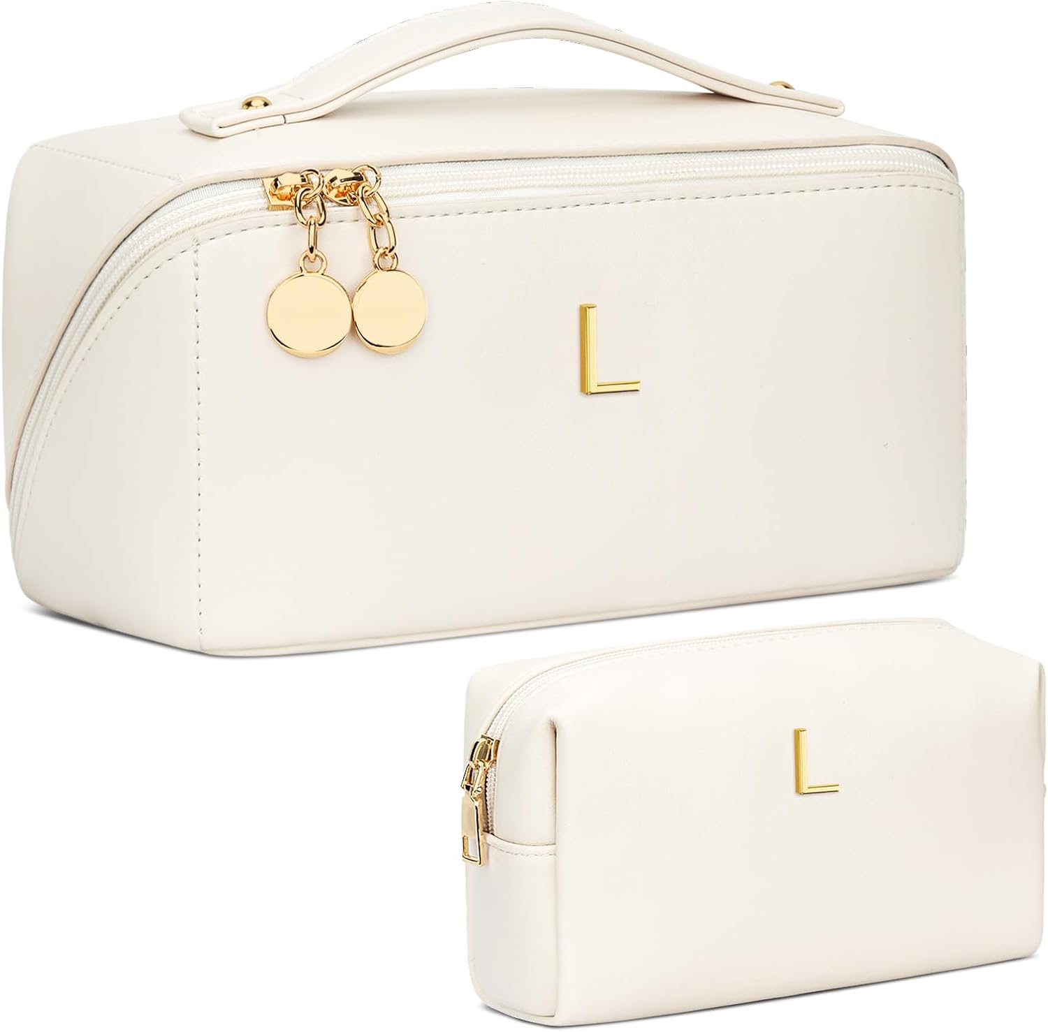 Birthday Gifts for Women Teen Girl, Personalized Initial Makeup Organizer Bag Set, Open Flat Travel Cosmetic Bag With Clear Divider and Handle(Beige,L)