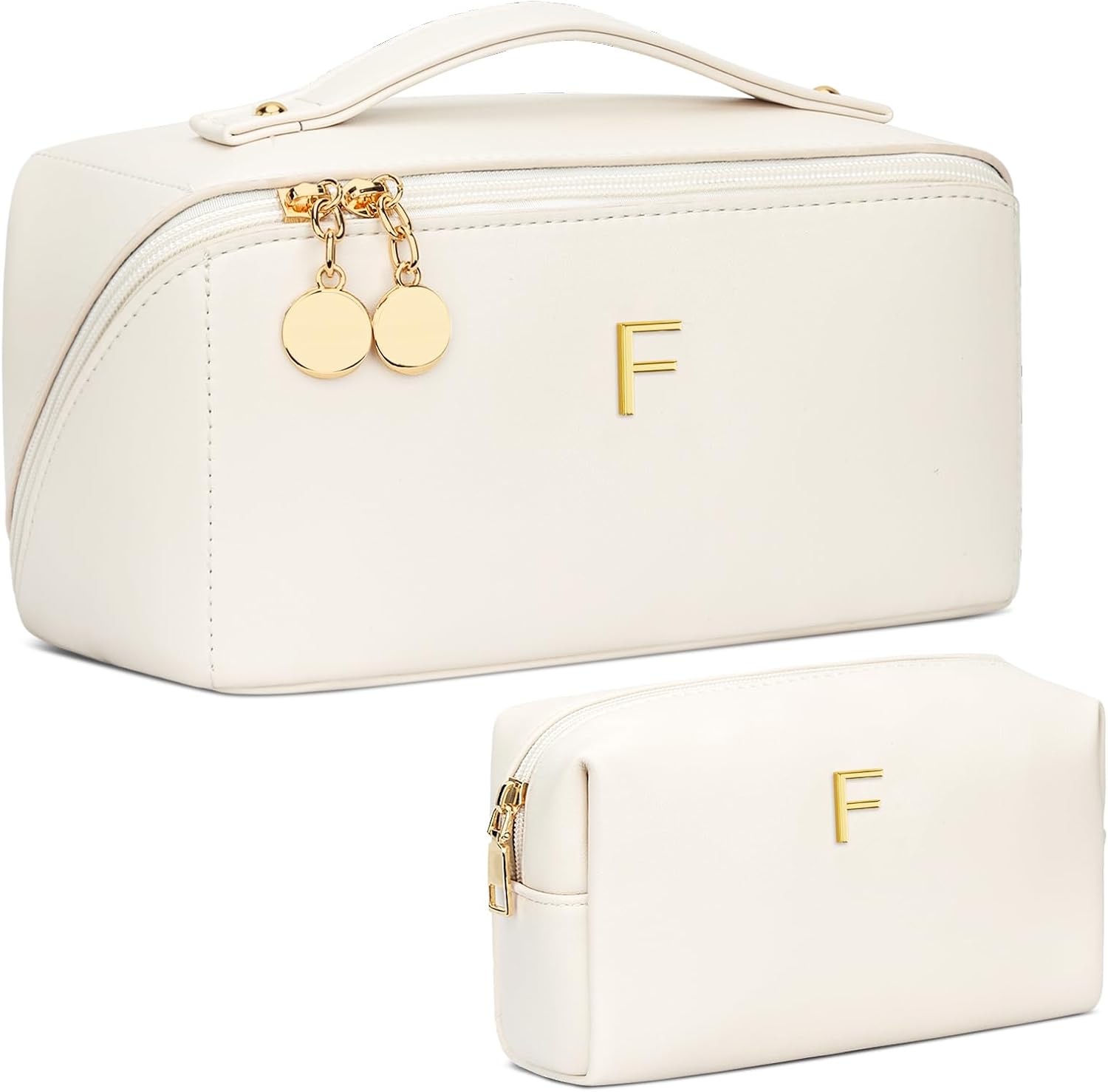 Birthday Gifts for Women Teen Girl, Personalized Initial Makeup Organizer Bag Set, Open Flat Travel Cosmetic Bag With Clear Divider and Handle(Beige,F)