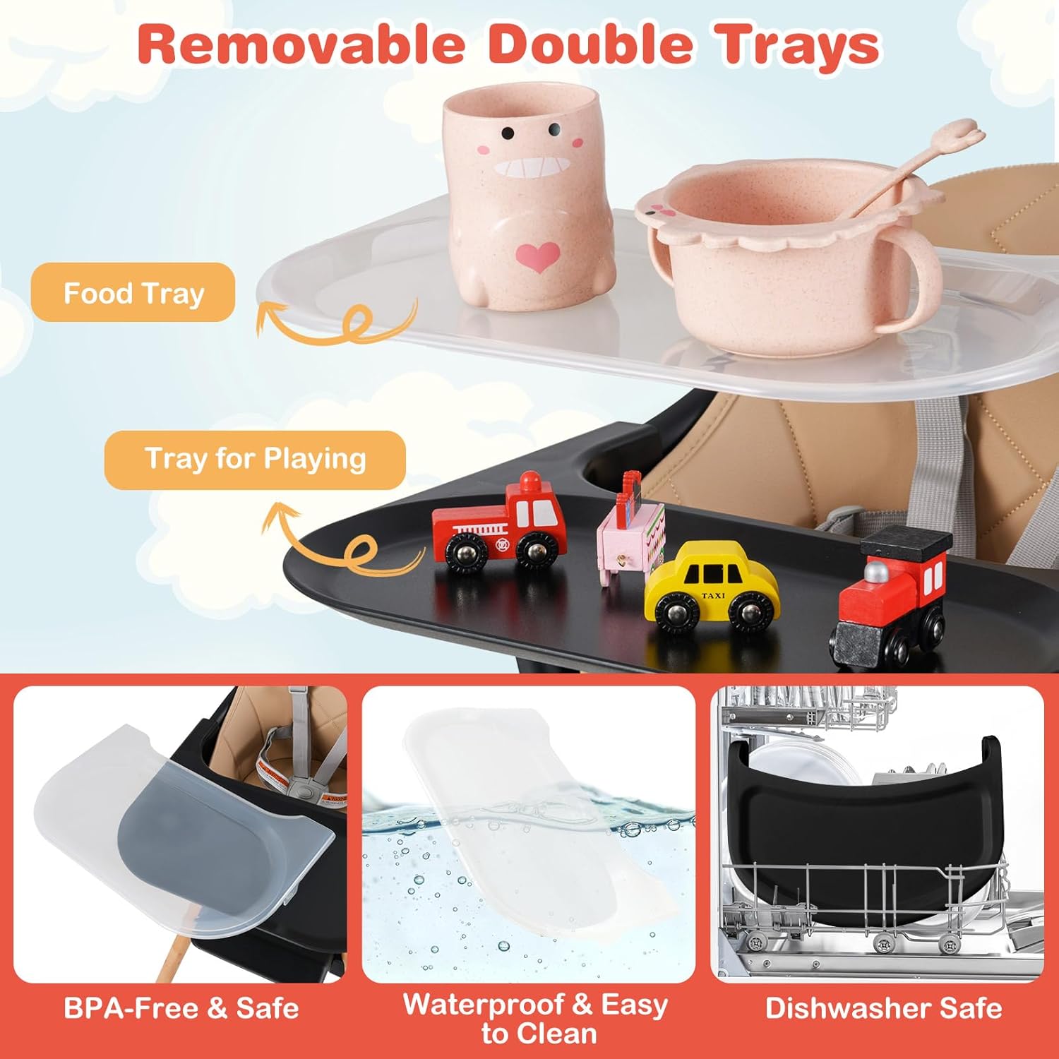- 【Removable Double Trays】This convertible baby high chair comes with an upper food tray and a lower tray for playing. The trays are made of BPA-free & safe PP material. In addition, they are removable, dishwasher safe, waterproof and easy to clean.