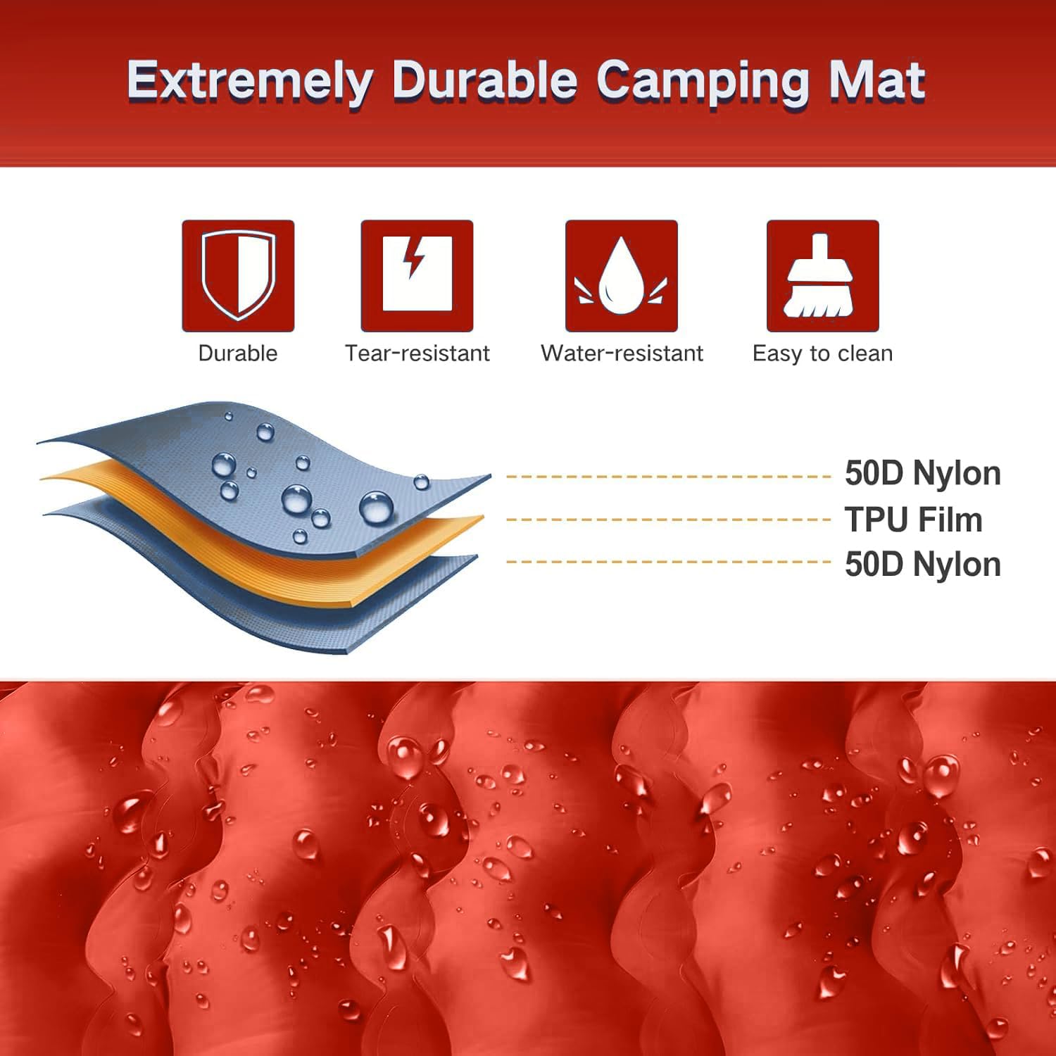 - DURABLE & PORTABLE: Ultra-thick waterproof 50D nylon and TPU eco-friendly materials, durable and tear-resistant, make this compact sleeping pad perfect for harsh environments in the field. The thickened film ensures that our self inflating camping pad is effectively puncture and moisture resistant without air leakage. Such a camping air mattress weighs only 5lbs, packs 2 people's sleeping gear in just one, You can say goodbye to sore backs and other discomforts normally left by bumps and rocks underneath the floor of your tent! ideal for family camping, hiking, backpacking, car trips, or for guests at home.