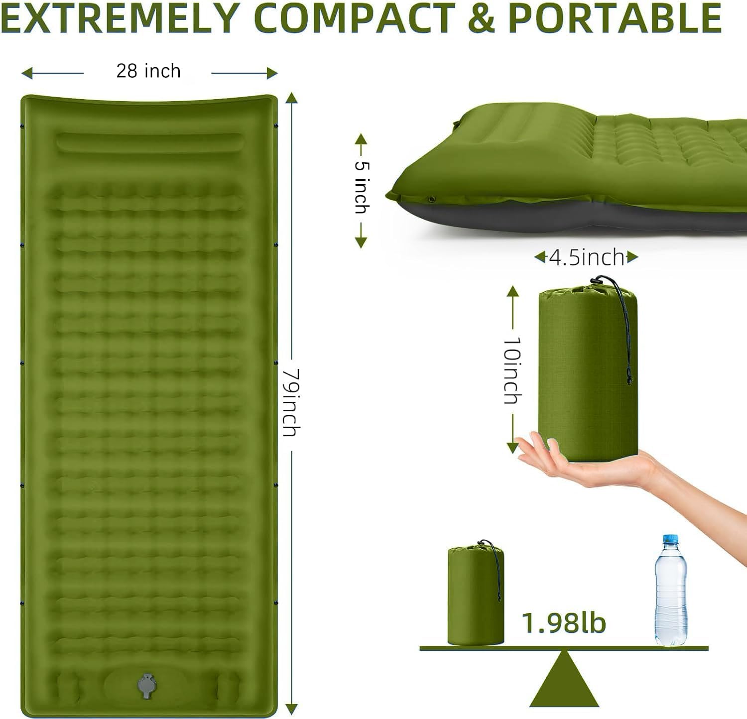 - 【Extra Wide & 5" Thick Sleep Support】 The self inflating pad for camping is up to 79“L x 28”W x 5“Th, after inflating keeps you away from the uneven ground and hard rocks. The innovative egg-shaped air cells and built-in pillow are designed to relieve back and neck pressure, allowing you to freely adjust your body balance and comfort, whether on your back or your side, ensuring maximum comfort and warm for your sleep all night!