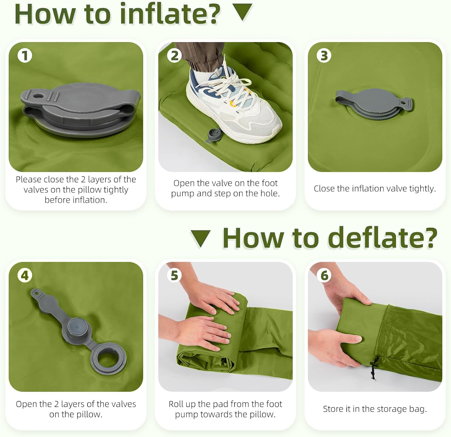 - 【Only 30s Step to Inflate & 1s Deflate】 Including an innovative built-in foot pump- Just pedal 30-60s to fully inflate the camping mat, which is convenient and easy, no longer need to inflate with your mouth, hands or carry a pump, and it only takes 1 second to quickly deflate. With the upgraded version of the air release valve with no leaking film, you shall never worry about air leaking!