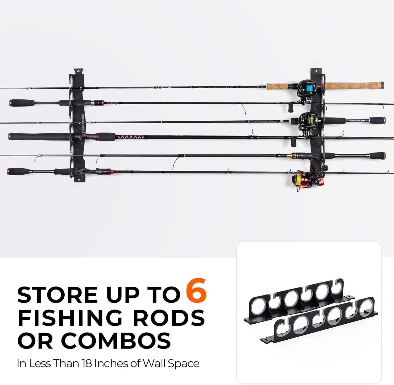 - KEY FEATURES - Store up to 6 fishing rods or fishing rod and reel combos – Features soft polymer lined openings for the handle and top sections to prevent damage to your fishing rods. Easily store rods of any length or diameter out of the way and safe. Easy installation with the included hardware.