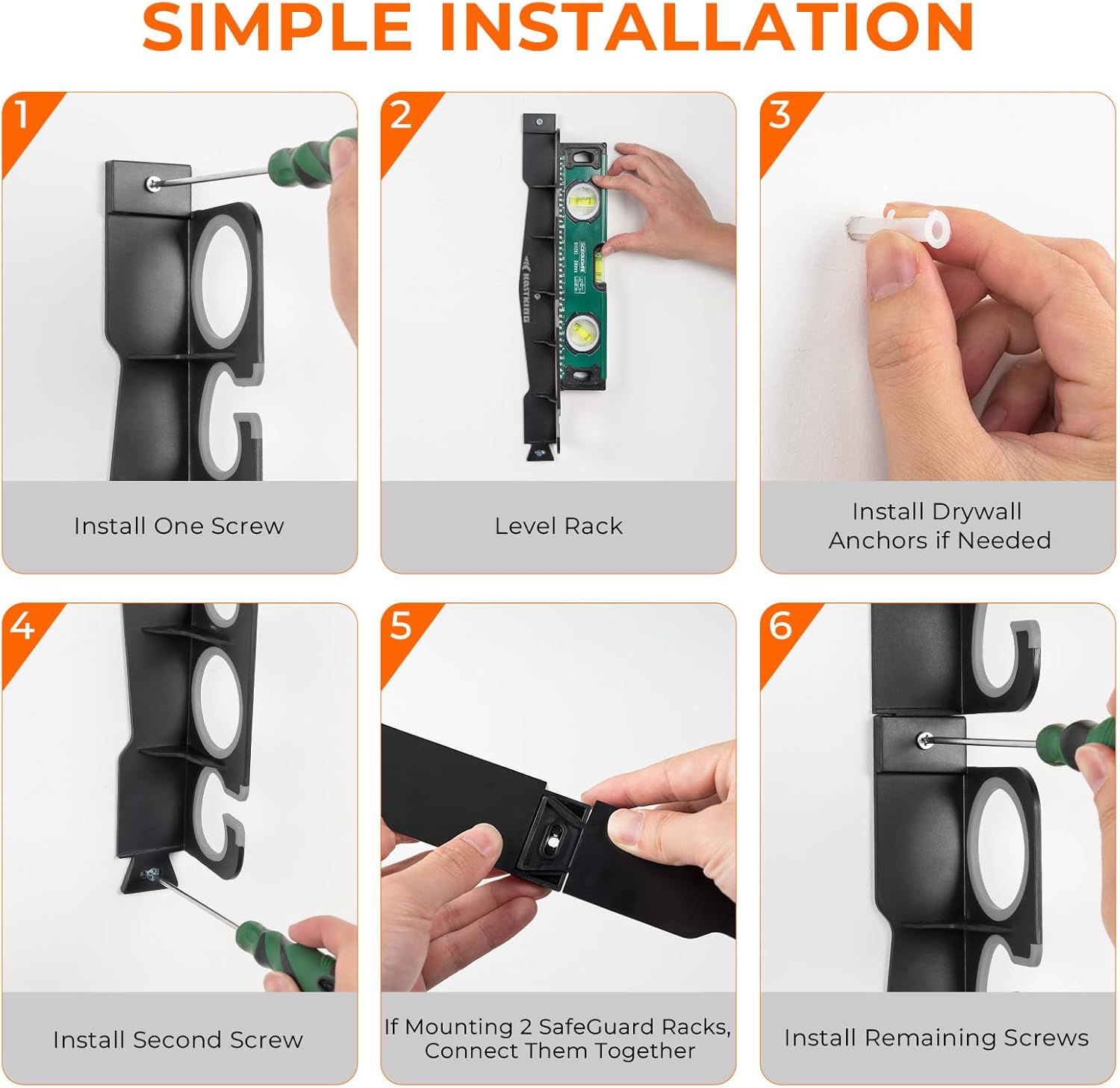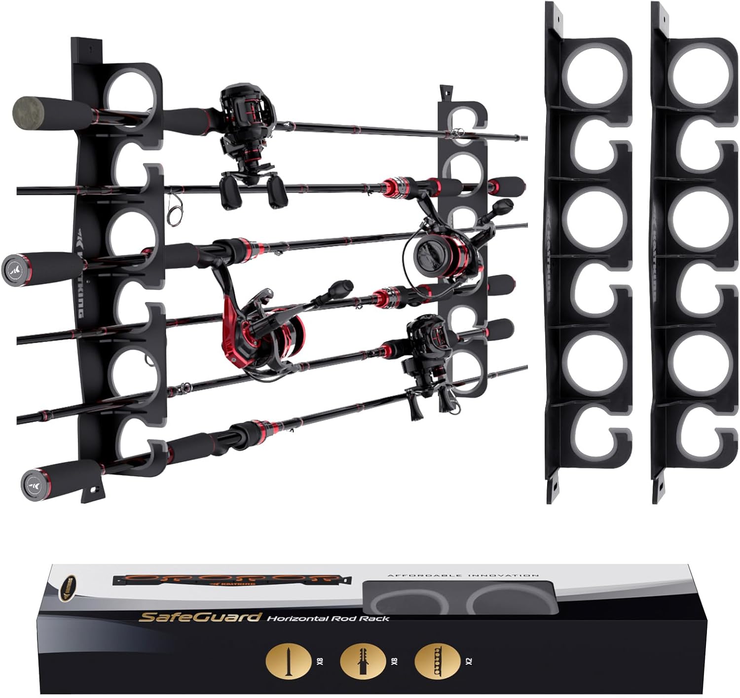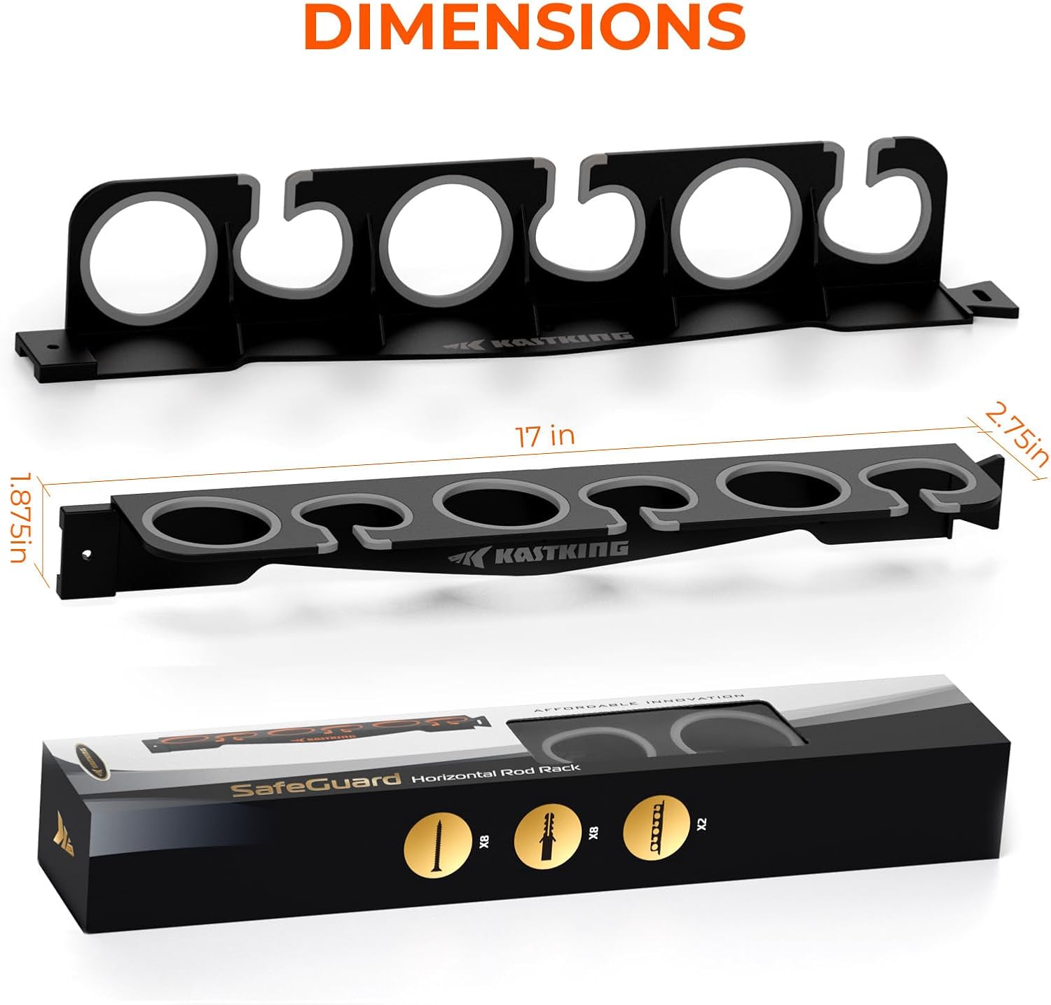 - STORE 6 RODS OR COMBOS – The KastKing SafeGuard fishing rod rack can store up to 6 rods or combos in less than 18” of wall space. We have also designed interlocking ends making it easy for you to string a series of SafeGuard rod racks together for even greater storage capacity.