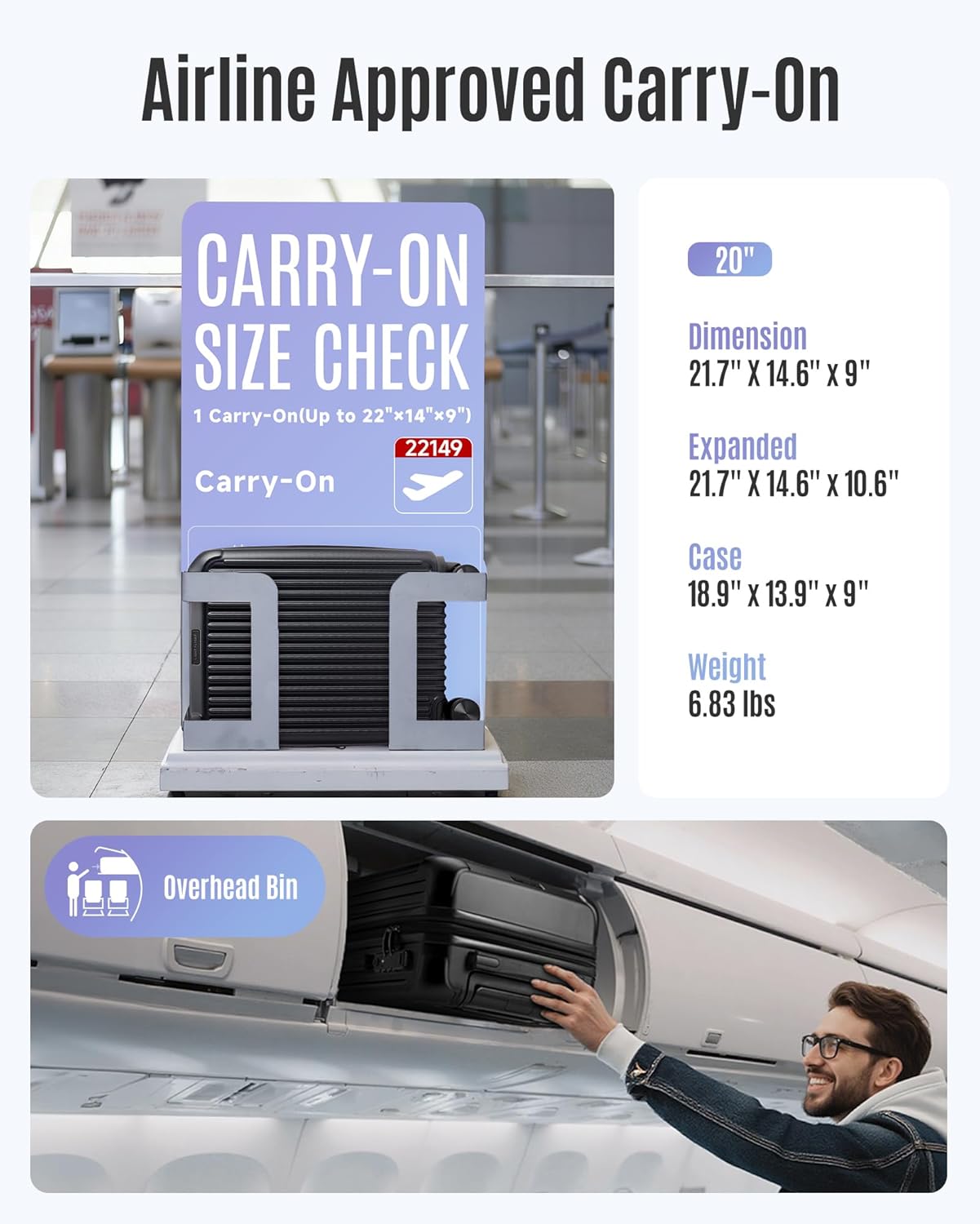 - Airline-approved Luggage: This 20-inch carry-on Luggage meets the overhead compartment size requirements of most airlines. The durable hardside luggage features TSA-approved locks and smooth double-ended zippers for secure and convenient travel. It has a volume of 35 liters and weighs only 6.83 lbs.