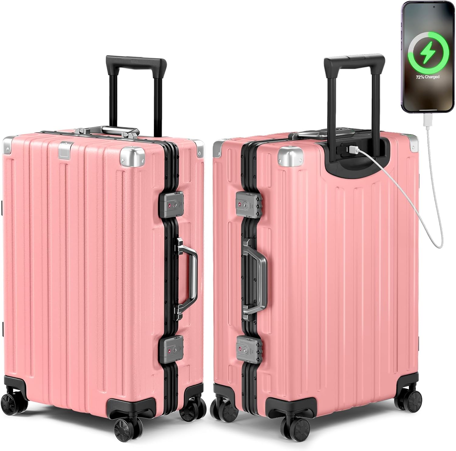 Krute Checked Aluminum Frame Suitcase 24 Inch Zipperless Luggages Hardside PC Luggage With Spinner Wheels TSA Lock USB Charger Suitcases(1 Piece)