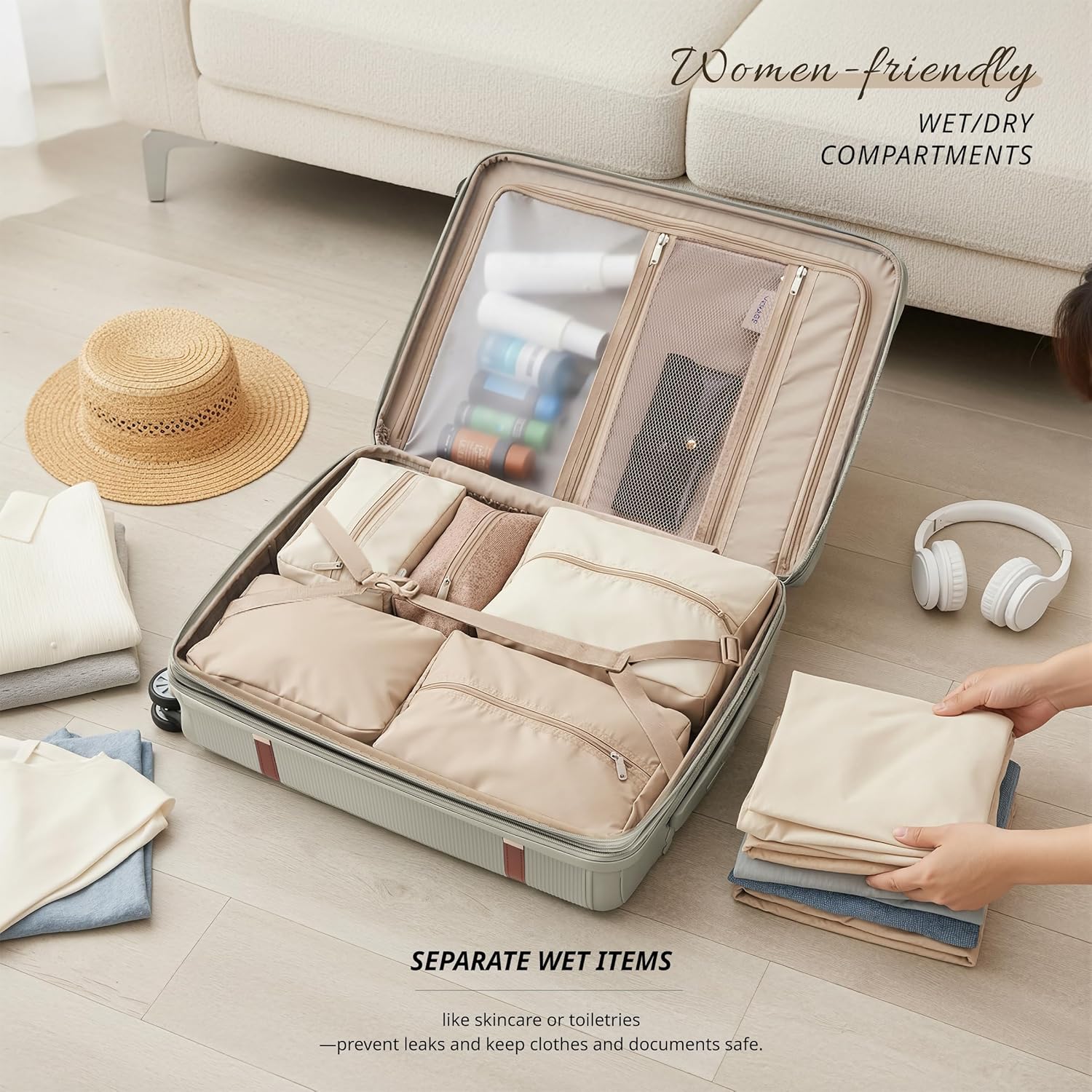 - Organization & Expandable:Designed with women travelers in mind, this carry-on features multiple compartments and a dedicated wet/dry pocket to keep skincare, swimwear, or damp clothes separate from delicate items. The expandable suitcase design adds room for your favorite shoes, performance outfits, or travel finds