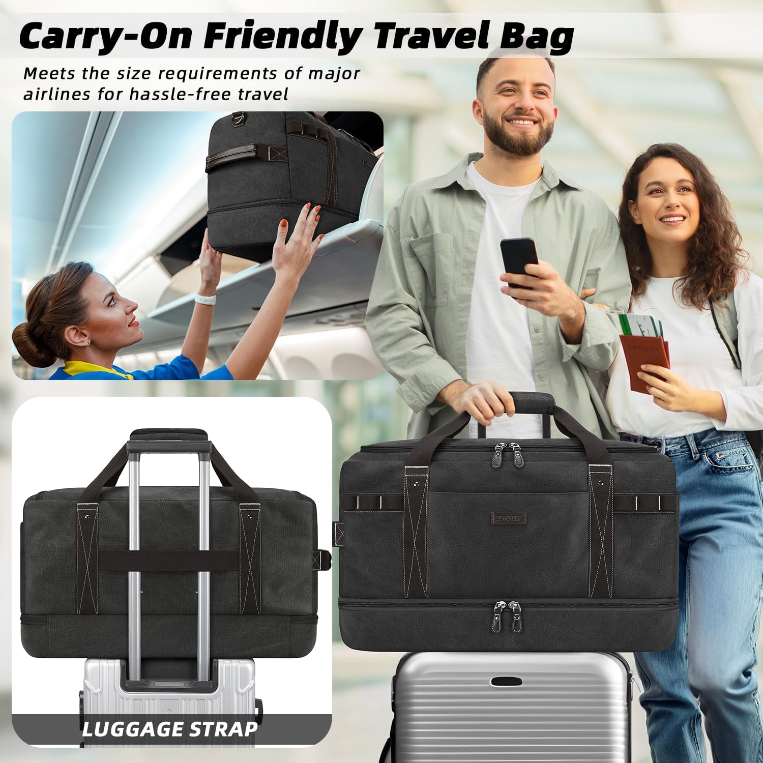 ZOMFELT Travel Duffle Bag for Men, Waterproof Canvas Overnight Duffel Bag with Removable Dividers & Shoe Compartment, Carry On Weekender Gym bag, Multi-Pocket & Vintage Design (Washed Black)