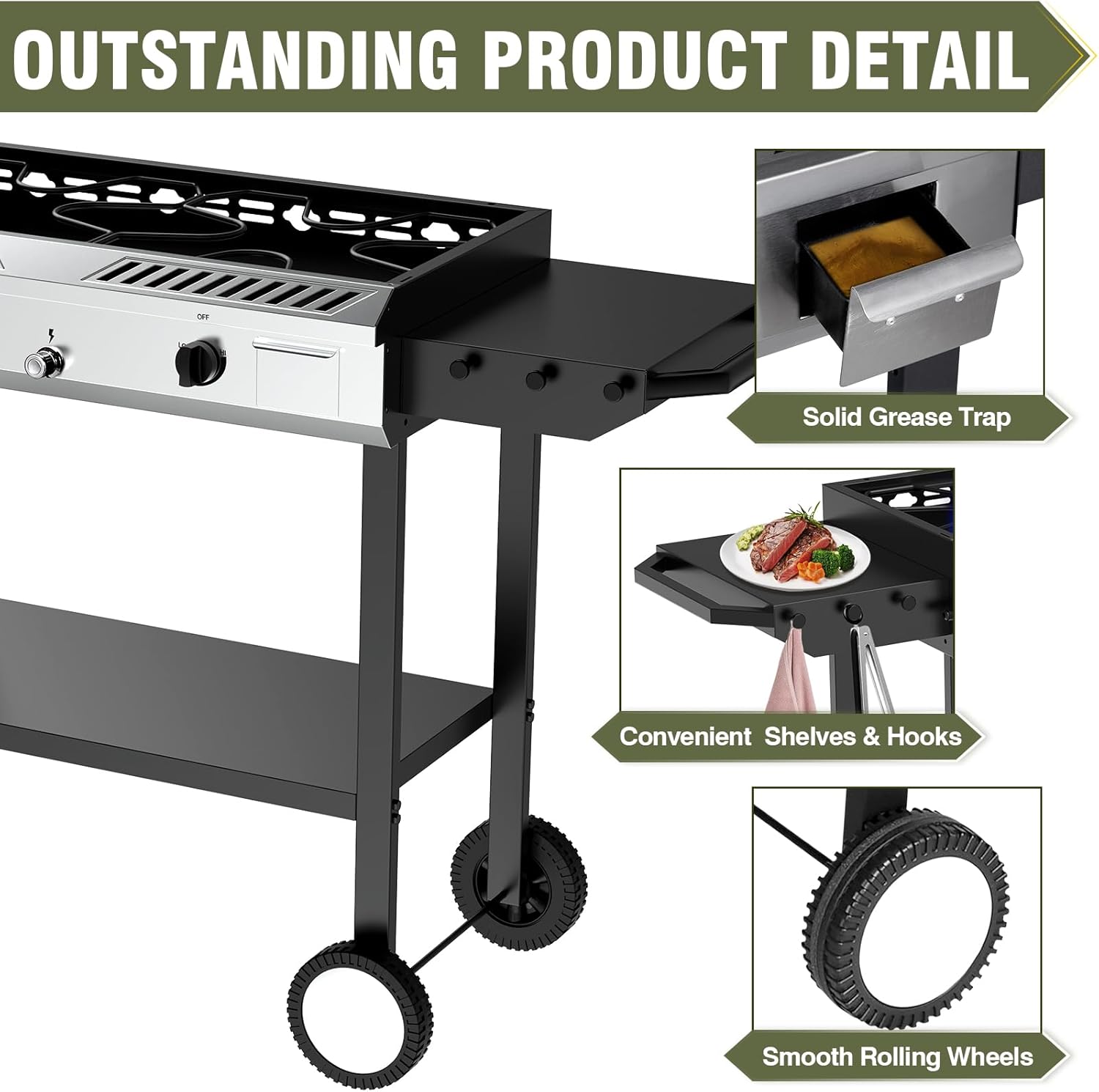 - π Easy to Move & Store β Comes with sturdy wheels for portability, two side shelves for prep space, and a bottom rack for propane tanks or utensilsβideal for tailgates, campsites, and patios.