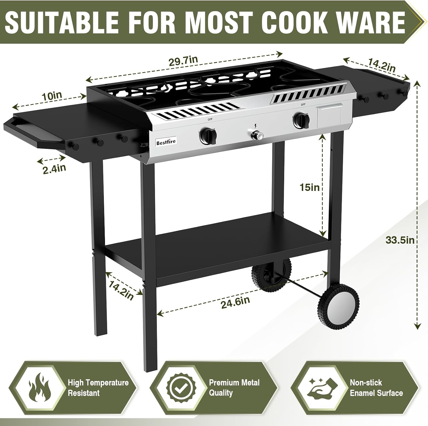 BESTFIRE 2 Burner Propane Gas Stove Outdoor Cooking Station β 150,000 BTU Double Cast Iron Burner with Auto Ignition, Regulator, Side Shelves & Wheels β Portable No-Windshield Design for Camping